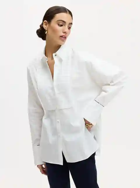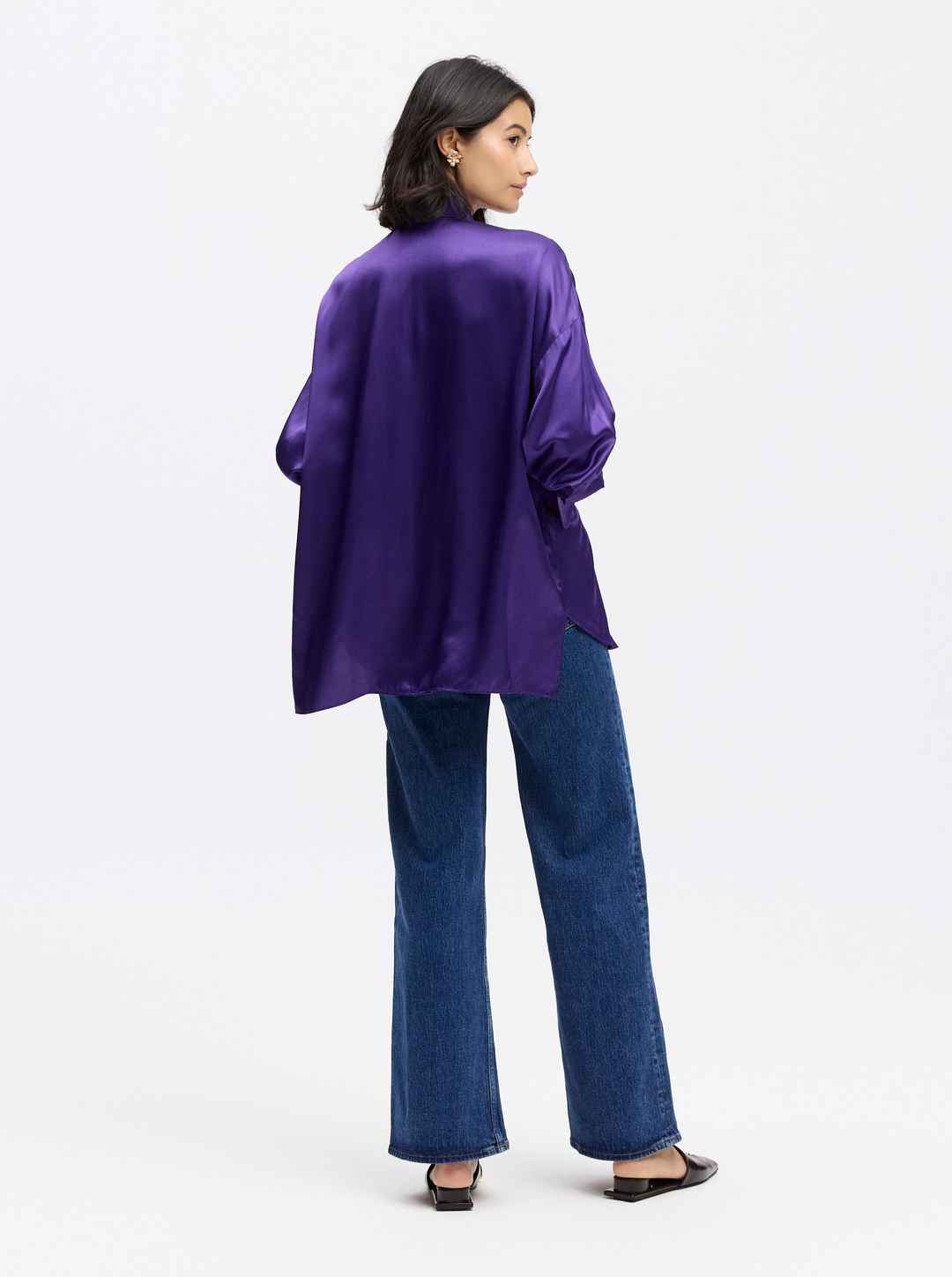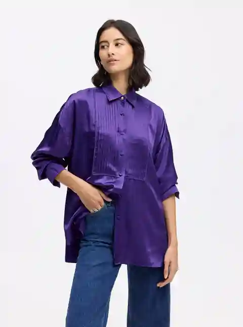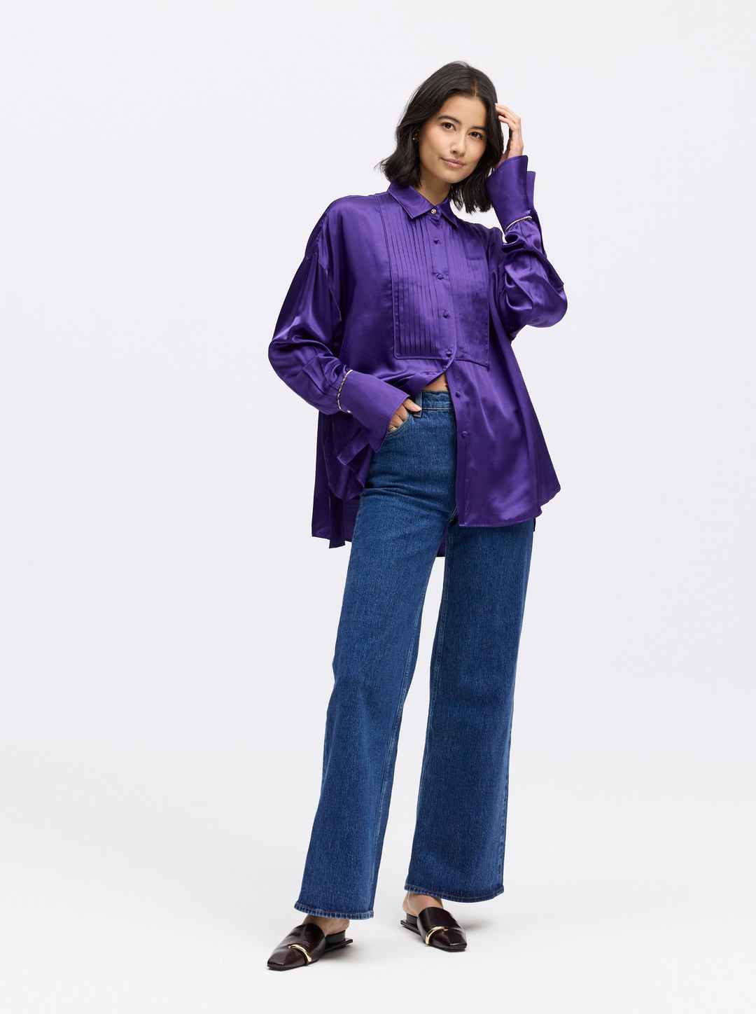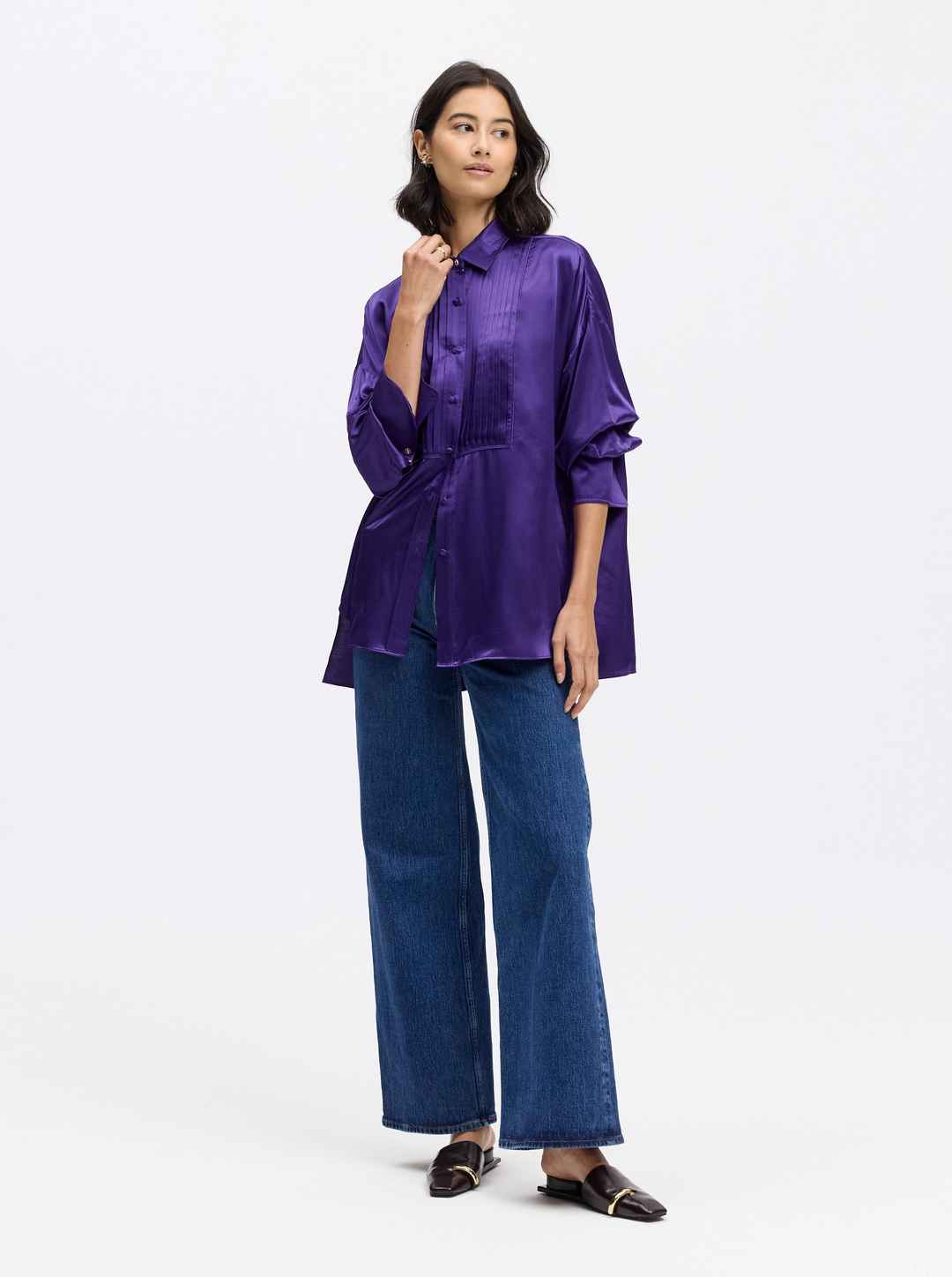 This unexpected take on a classic button-down shirt is sure to turn heads. With a pleated bib front and an oversized fit, this tuxedo-style shirt is instantly event-ready. The silk blend charmeuse fabric feels like a dream and the deep violet shade brings a regal touch. Point collar Front button pla...more