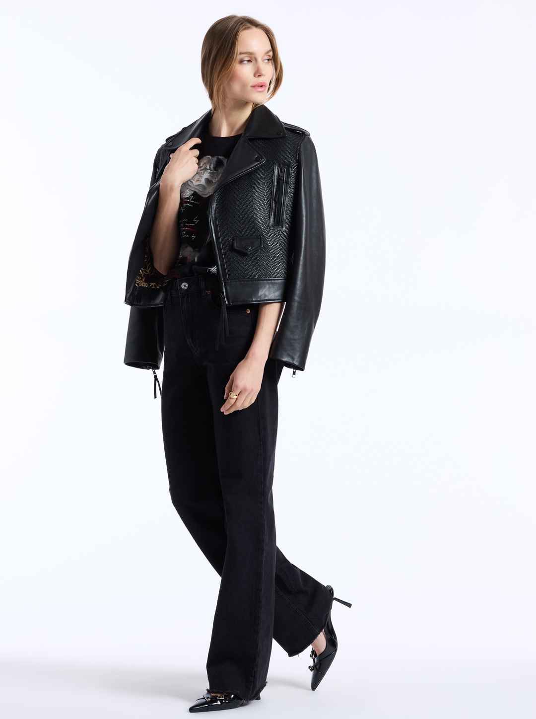 Look effortlessly cool in this asymmetrical leather moto jacket. This style stuns with a herringbone basket weave leather at the front body for a chic contrast to the soft lamb leather sleeves and trim. Zippers at the sleeve cuffs offer a customizable look. Don't miss the interior lining for added w...more