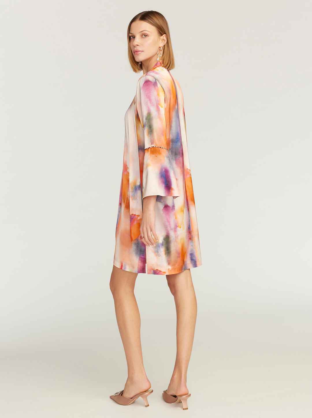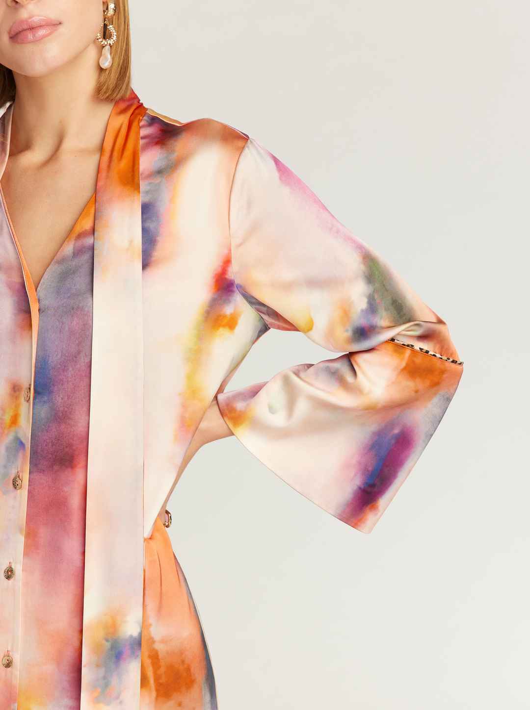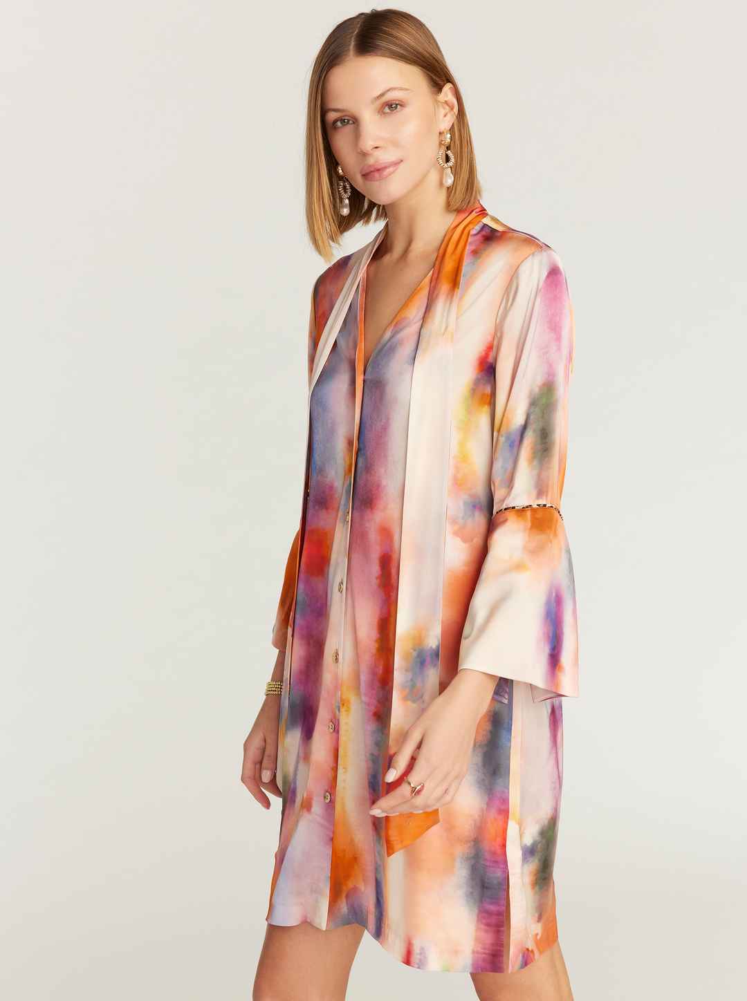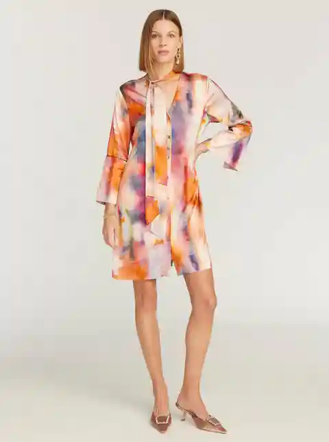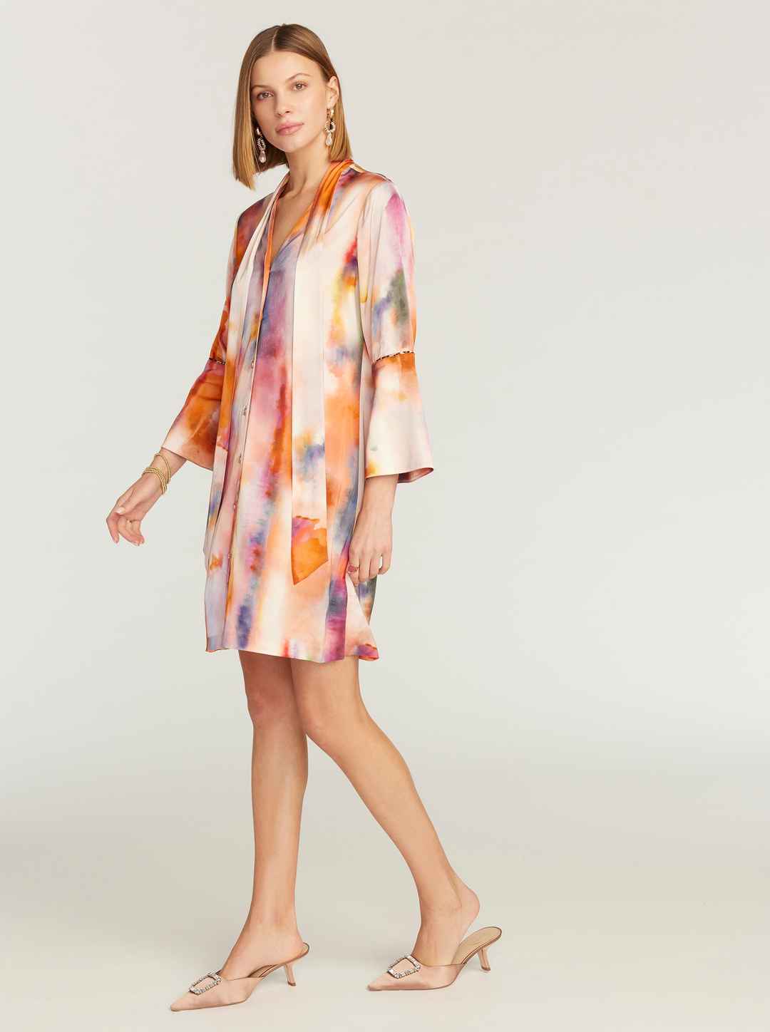 Be prepared to wow in this RG favorite. This ultra-feminine take on the shirtdress silhouette comes to life in a romantic watercolor print. With a self-tie neck and long sleeves with bell-shaped cuffs, this silk-blend crepe de chine dress is a stunner. Wear this flirty style to any occasion. V-neck ...more