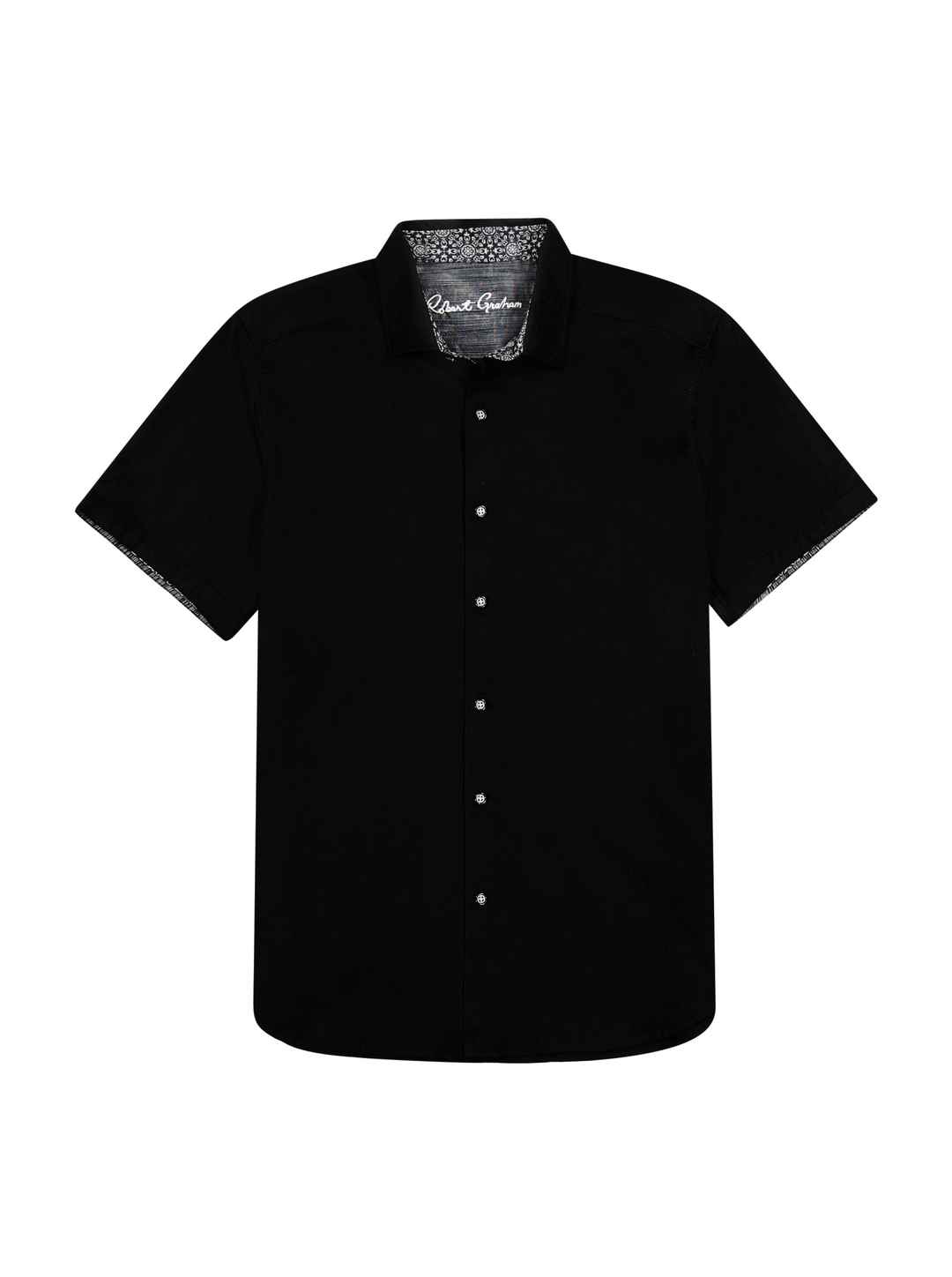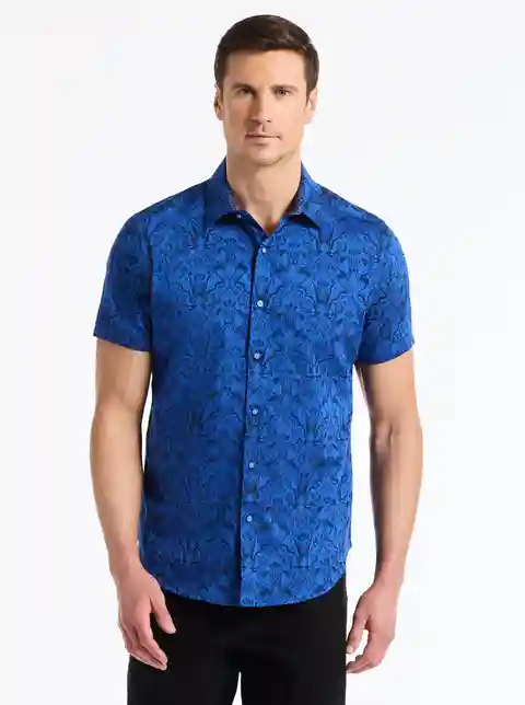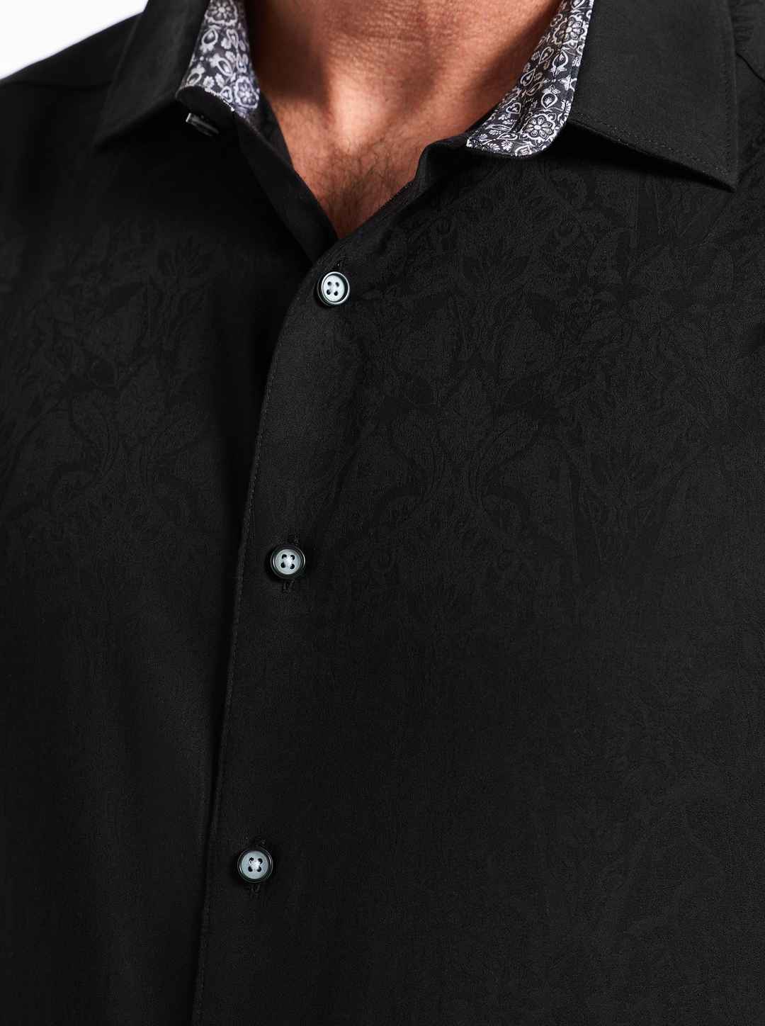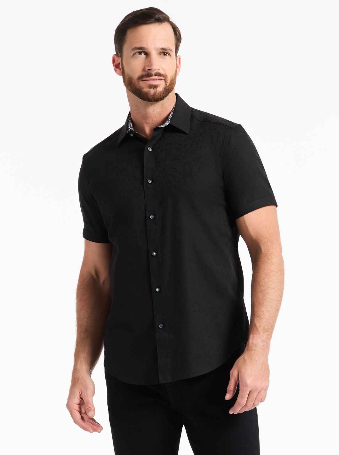 Youll love this RG best seller and Collector favorite. Now discover our newest essential jacquard, The Highland. A damask motif is celebrated on this stretch cotton jacquard short sleeve button down shirt. Flip the collar for a contrast print. Point collar Full button front Short sleeve Damask jacqu...more