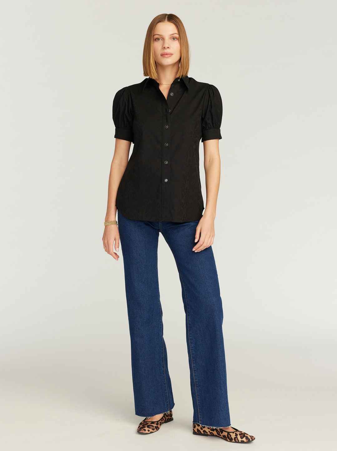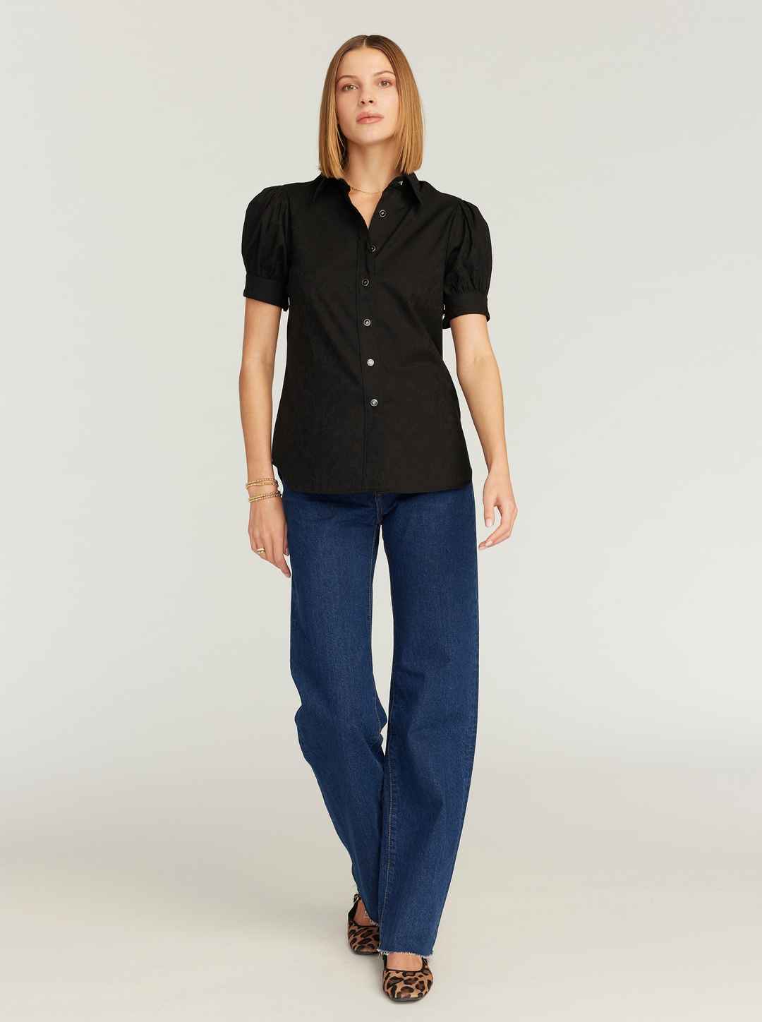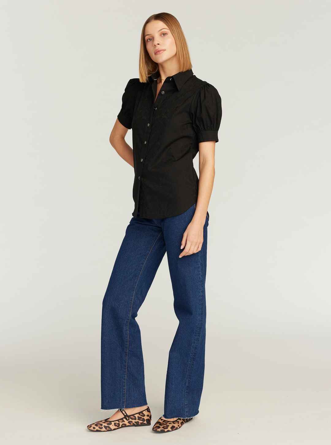 This ultra-feminine short sleeve blouse with barrel cuffs is the perfect top for any occasion. You'll love how our classic RG highland jacquard elevates a basic solid. Notice the contrast border print details for an extra punch. Novelty buttons at collar and cuffs give this piece a delicate finish. ...more