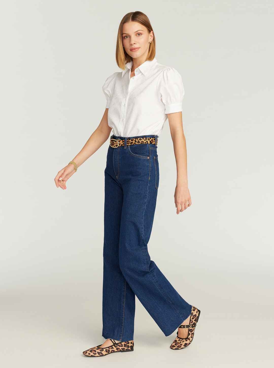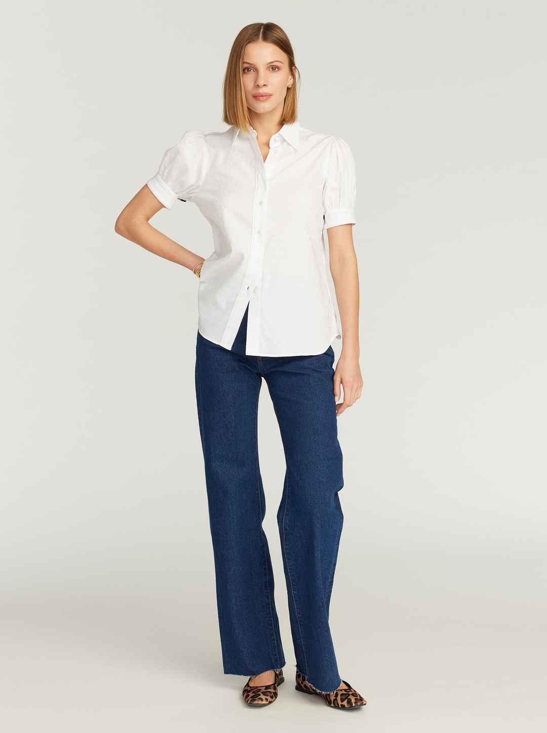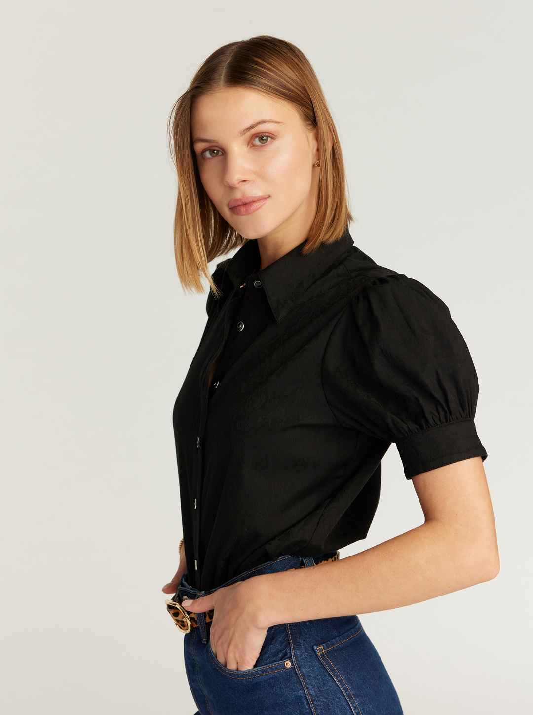 This ultra-feminine short sleeve blouse with barrel cuffs is the perfect top for any occasion. You'll love how our classic RG highland jacquard elevates a basic solid. Notice the contrast border print details for an extra punch. Novelty buttons at collar and cuffs give this piece a delicate finish. ...more