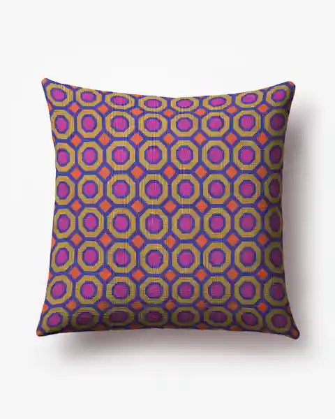 Bold geometric octagon tiles in an elevated Hollywood regency style bring a touch of posh glamour. The bold fuchsia base is complemented by pops of cobalt blue, gold, and orange, creating a mod statement piece. Water-resistant, stain-resistant, and machine-washable. Colors may vary slightly accordin...more