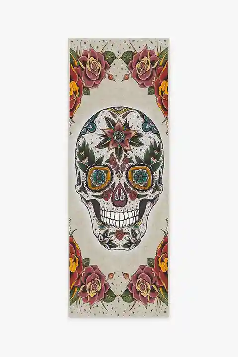 This dynamic, tattoo-style design is classic and colorful, featuring a smiling calavera, (Spanish for "skull") adorned with sparkles and an array of flowers in hues of tomato red, rose, marigold and leaf green.. Ruggable runner rugs are perfect for entryway, bathroom, kitchen and outdoors. Our rugs ...more