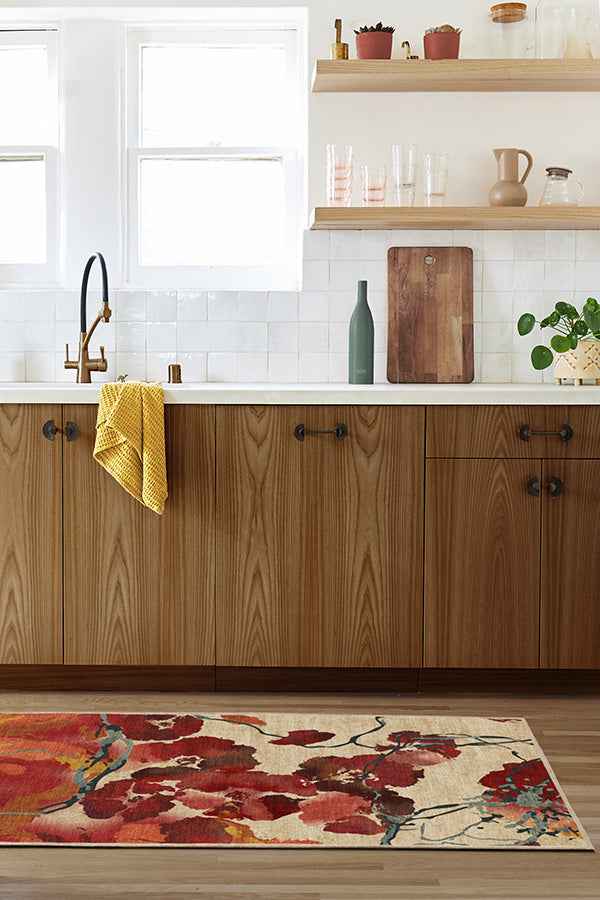 Bring artistic flair to your home's interior with our Watercolor Floral Coral rug. The contemporary floral motif features dramatic brushstrokes of vibrant colors on a canvas of cream and natural peach hues. Add this work-of-art accent piece to complete the look of any contemporary, modern or transit...more