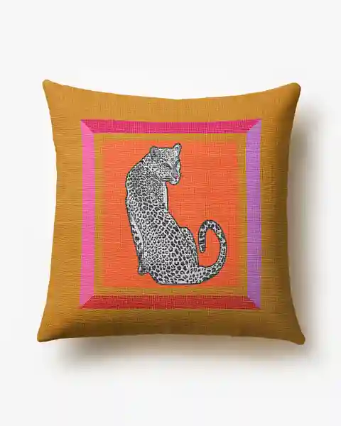 A showstopping snow leopard motif framed in bold geometric lines evokes a feeling of Hollywood regency glamour. Vivid orange, pinks, red, and lavender pop against accents of cognac and gold, creating a vibran design thats anything but ordinary. Water-resistant, stain-resistant, and machine-washable....more