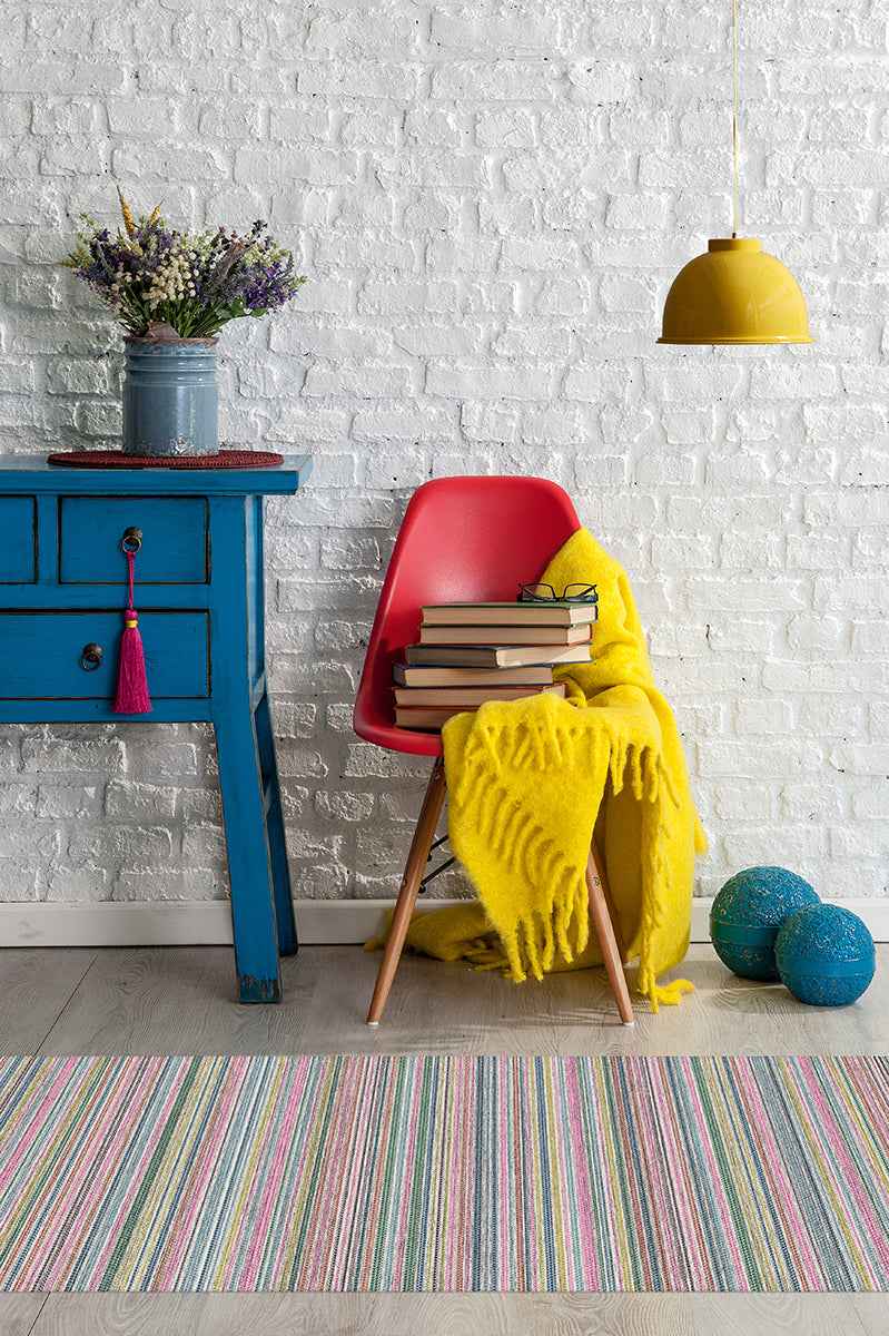 Our Multi Stripe Polychrome rug will daringly infuse a burst of color to your home decor. The contemporary, woven textured motif comes to life with a vibrant coloring of pearl, coconut, ocean blue, concord grape, fuchsia pink, tomato red, evergreen, seafoam blue and limoncello. This unique, decorati...more
