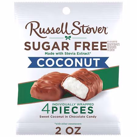 Indulge in the irresistible taste of RUSSELL STOVER Sugar Free Coconut in Chocolate Candy. Each 2 oz. bag contains about 4 individually wrapped pieces of sweet coconut filling wrapped in our delicious chocolate candy. Crafted with Stevia extract, a plant-based sweetener, our sugar free coconut candy...more