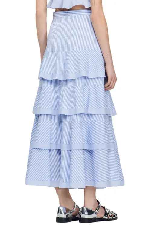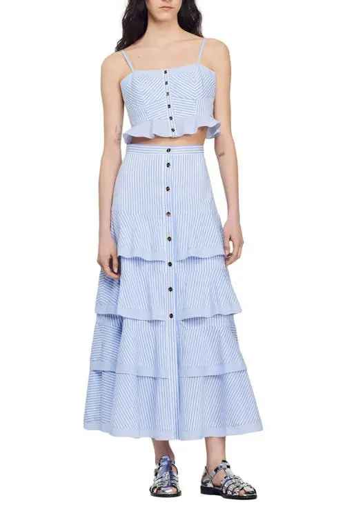 This button-front maxi skirt is fashioned in lively stripes with flouncy tiered ruffles. Lined 63% cotton, 32% polyamide, 5% elastane Machine wash, line dry Imported