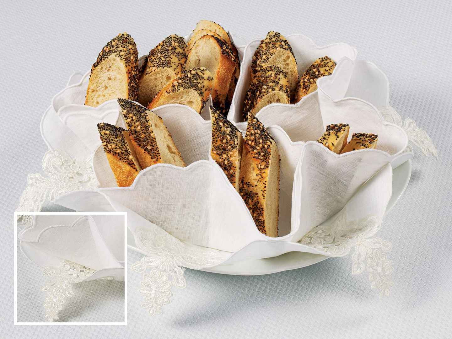 <p>Rouleaux Bread Basket Liner Bread Basket Liner, White (15" Round) There’s much more to this bread warmer than meets the eyes. In addition to the exquisitely-detailed Alençon lace inserts and luxuriant 100% Italian linen, with two simple snaps it transforms into a s...more