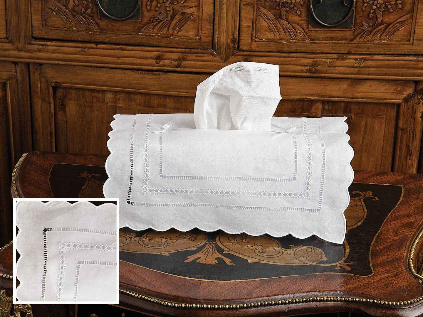 <p>Hide &amp; Peek Tissue Box Covers, White (Tissue Box Cover) Our pretty cover-up hides your tissue box under pristine linen-cotton fabric , but leaves just enough room for tissues to peek out. Proudly crafted by hand with three rows of hemstitching done with patience and care, its be...more