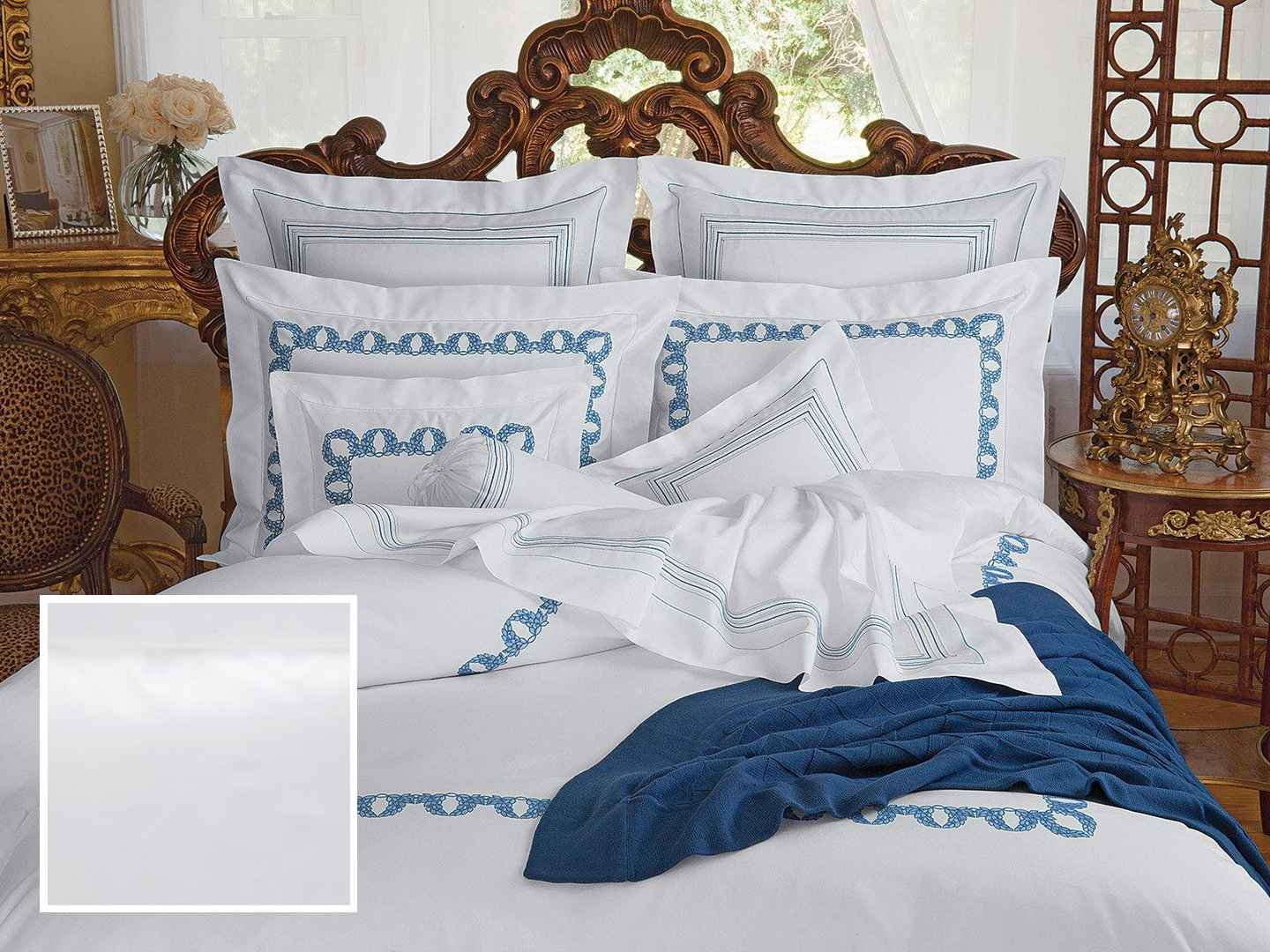 <p>Coronet Fitted Sheets,Fitted White Sateen (Twin ) The most beautiful way to rest on your laurels, literally and figuratively, is on a bed made with soft, silky, <strong>600 thread count</strong> White Egyptian cotton sateen, elegantly embroidered with laurel wreaths in Blue. All...more