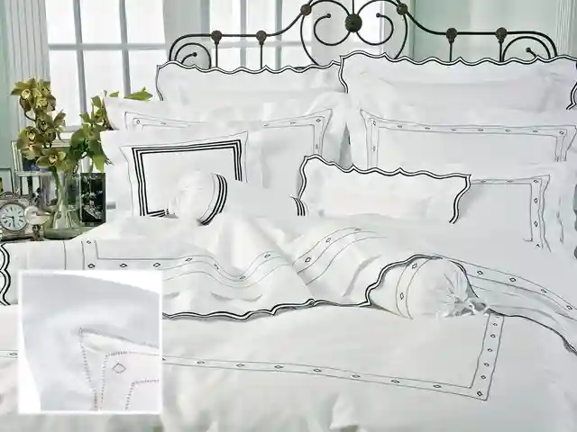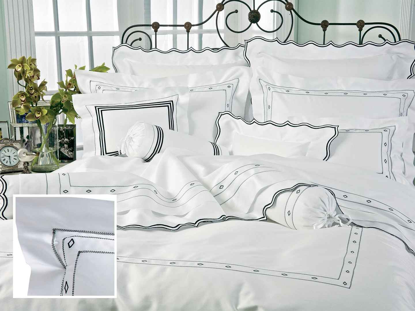 <p>Bijou Shams,Black (Euro. ) The priceless look of 600 thread count, pure Egyptian cotton sateen in luminous White, creates a magnificent setting for diamonds. Some, individually set like solitaires, are richly embroidered in Black or Taupe. Others, infinitesimal in size, are brilliantly arra...more