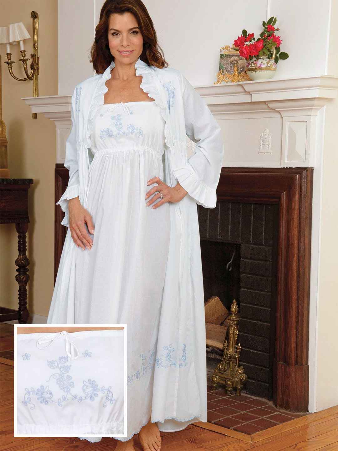 <p>Melanie Robes, Blue (Large) <span>Styled for the romantically inclined, all this beauty of a gown needs is you. Refreshing White cotton batiste is lovingly embroidered by hand with Blue flowers on top and all around the scallop edged skirt. Designed for fabulous fit with drawstring ne...more
