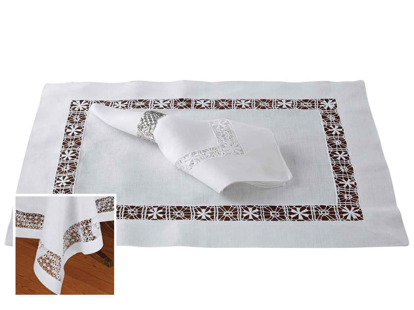 <p>St. Germaine Tablecloths (Rectangular), White (70" x 90") A feast for discerning eyes, finest pure White linen from Italy is skillfully adorned with extravagant inserts of stunning hand-drawn thread work, creating intricate and intriguing patterns of rare beauty. Imported, for hos...more