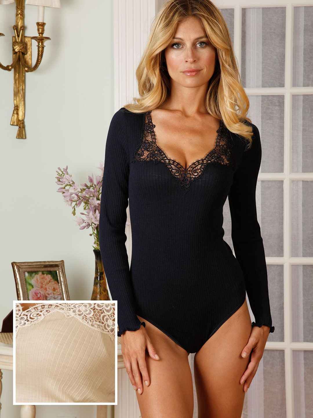 <p>Agatha Body Suit, Ivory (Large) So cool it's hot, our soft skinny-rib knit of 85% wool, 15% silk is made in Italy, where they know what women want in fashion and what men want in women. Imported in Ivory or Midnight Blue with borders of gorgeous lace, the all-in-one body suit has sn...more