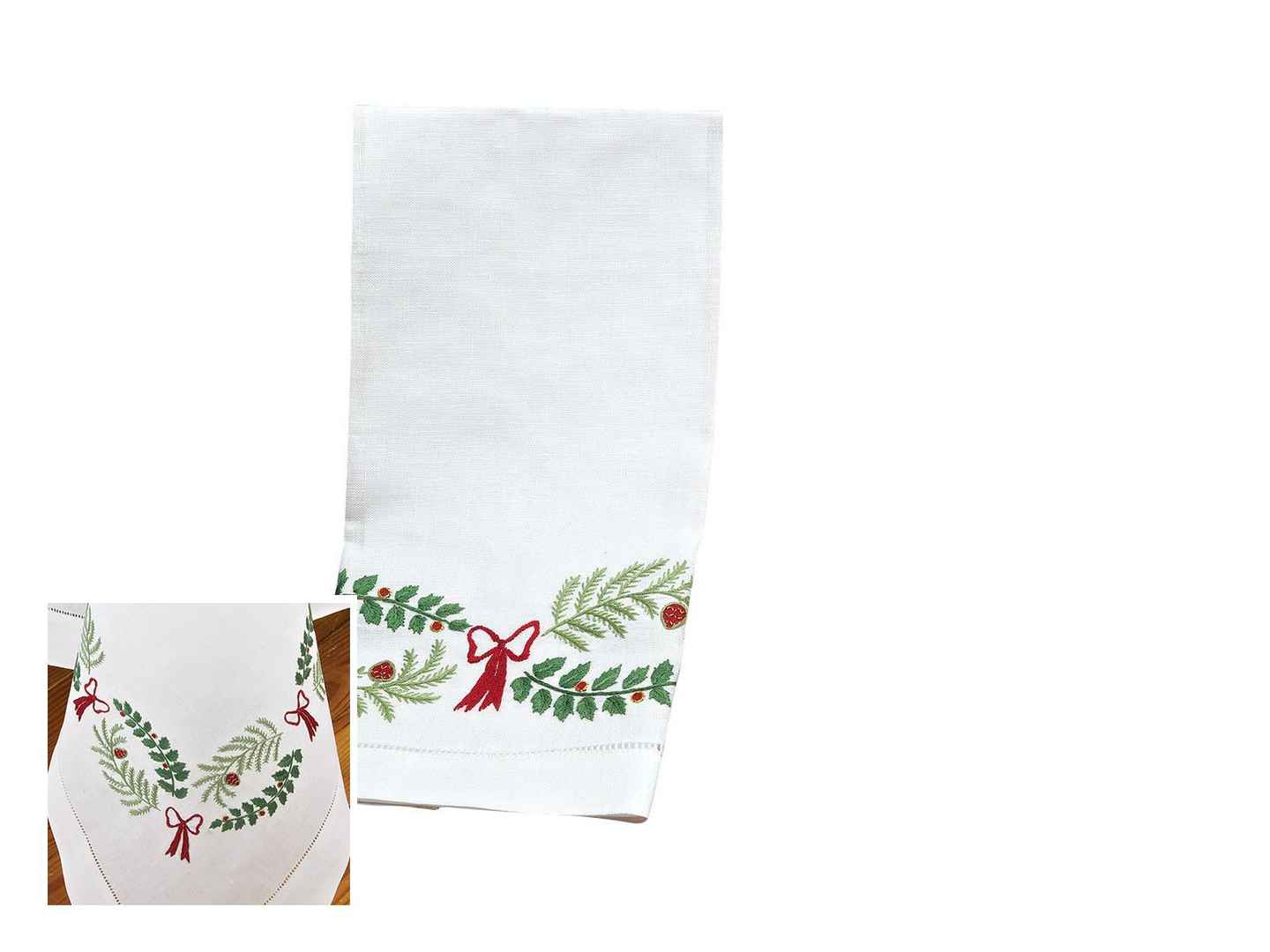 <p>Holly Days Table Linens Runners, Green &amp; Red (16" x 45") Let the festivities begin with elegance designed to set a new holiday tradition. Hand-embroidered with boughs of holly and bows in Green and Red, these entertaining tablecloths, placemats, napkins, cocktail napki...more