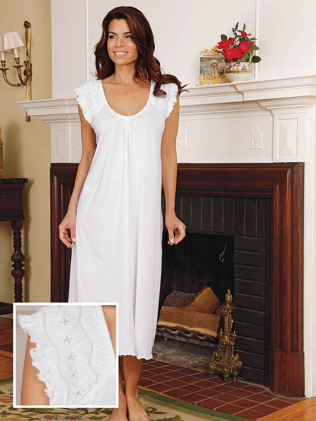 <p>Dania Gown, White (XL) A gown that pampers you so much it makes you feel as precious as it makes you look. Hand-made in Peru, with rufflely smocked and embroidered shoulders of feminine charm, it caresses your body with the unimaginable softness of White pima cotton jersey. (Almost like hav...more