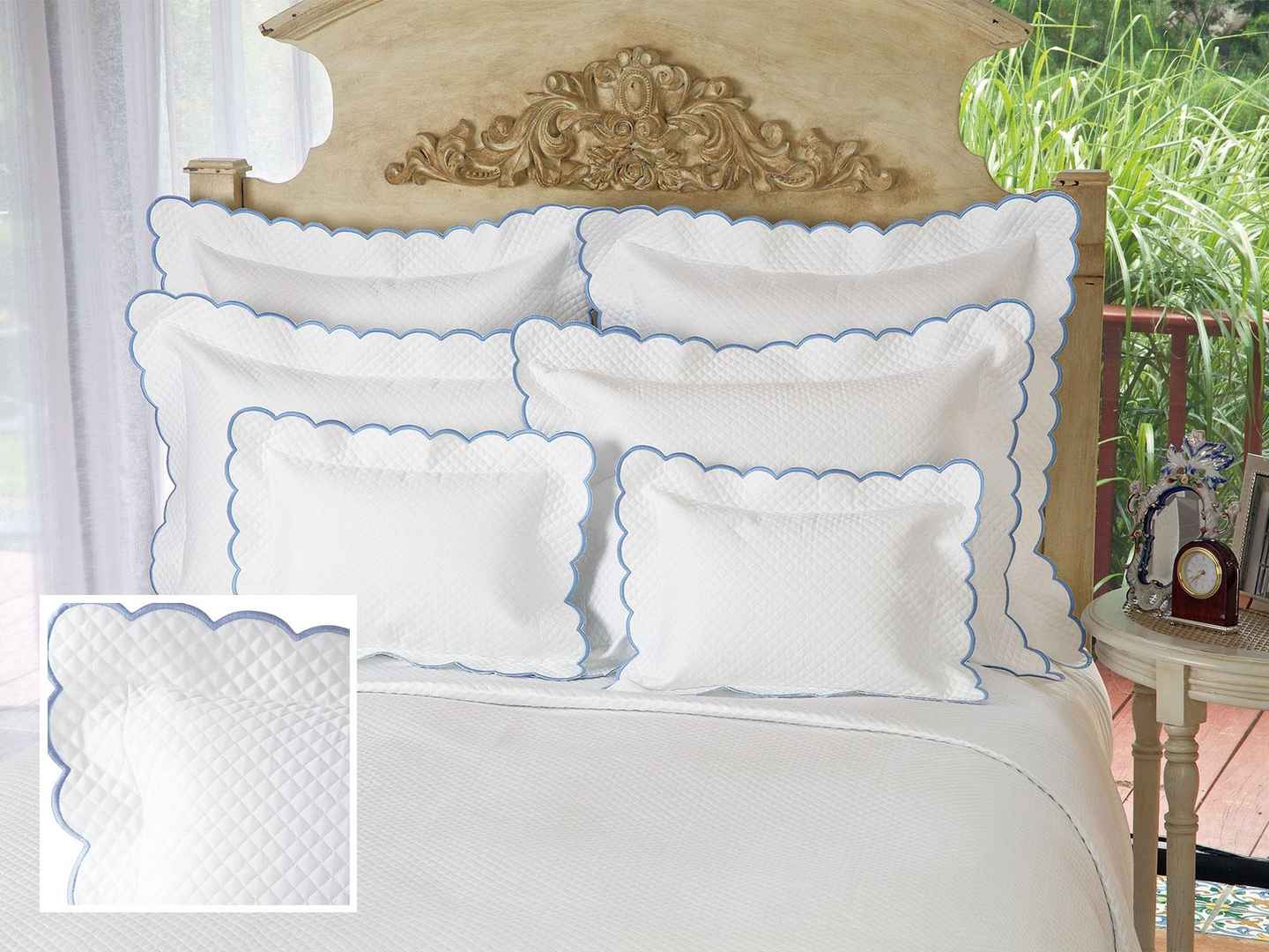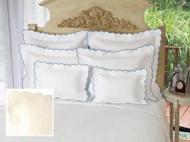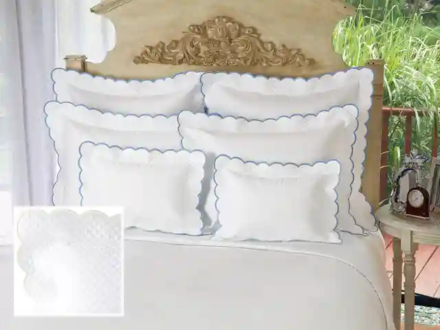 <p>Diamante Quilted Linens Shams,Blue (Std. ) Very posh, fine Egyptian cotton sateen, 300 thread count, glows with rich, many-faceted diamond quilting in White and scalloped in White, Blue, Navy, Ivory or Gray or Ivory quilted sateen with Ivory scallops. Bedcovers (blanket covers) and matching...more