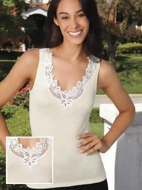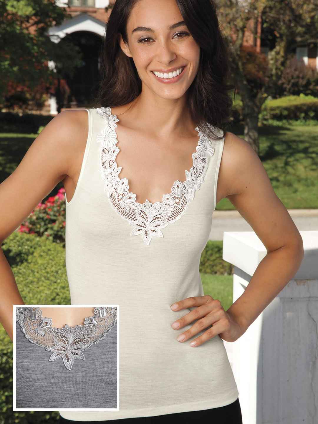 <p>Diana Camisole, Gray (Medium) Adorable and alluring, this camisole features magnificent floral lace along scoop neck for a captivating neckline and sweet coquettish style. Made in Italy of 85% merino wool and 15% silk to give you a close, yet comfortable feel with just the right amount of s...more