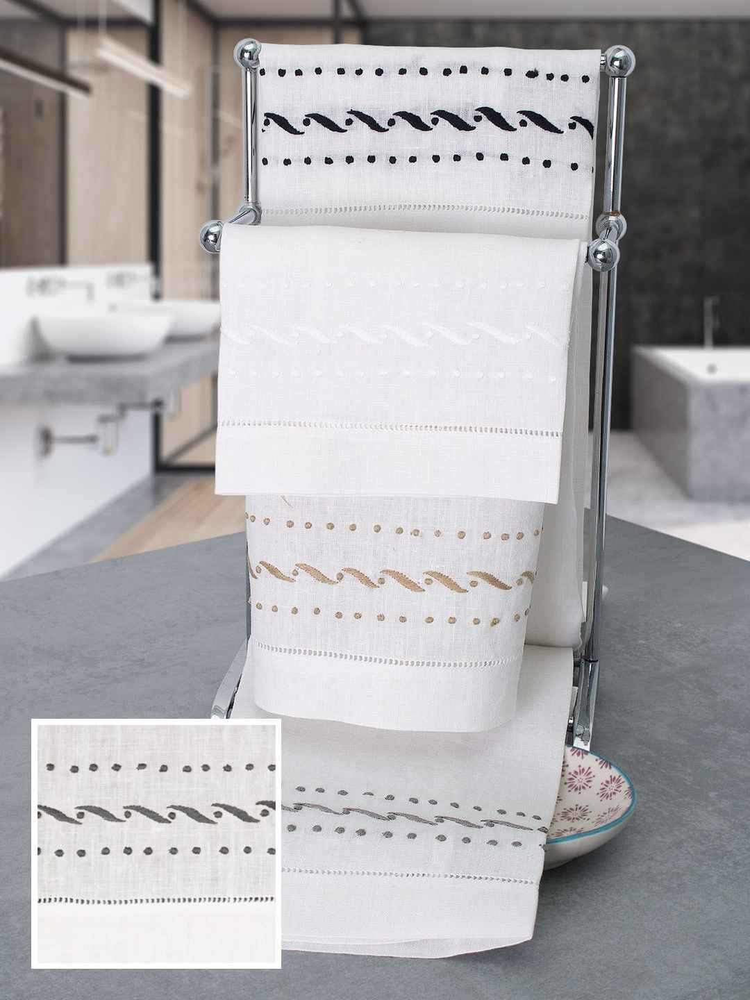 <p>Plaza Guest Towels Guest Towels, Gray (Set of 3) A perfect choice for anyone looking to modernize their bathroom without spending on remodeling. These 100% Italian linen guest towels feature rich, hand-embroidered twirls and dotted lines bathed in the soft shimmer of Beige, Black, ...more