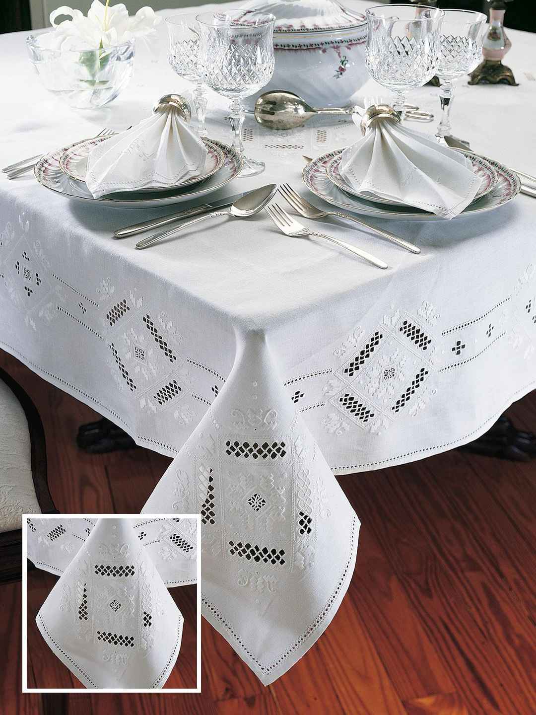 <p>Royale Tablecloths Tablecloths, White (70" x 90") Elegance of incredible beauty is displayed by these 100% pure Italian linen, White tablecloths and napkins. Imported. Hemstitching, open-cut work and embroidery - all hand done - create the perfect setting for lavish gath...more