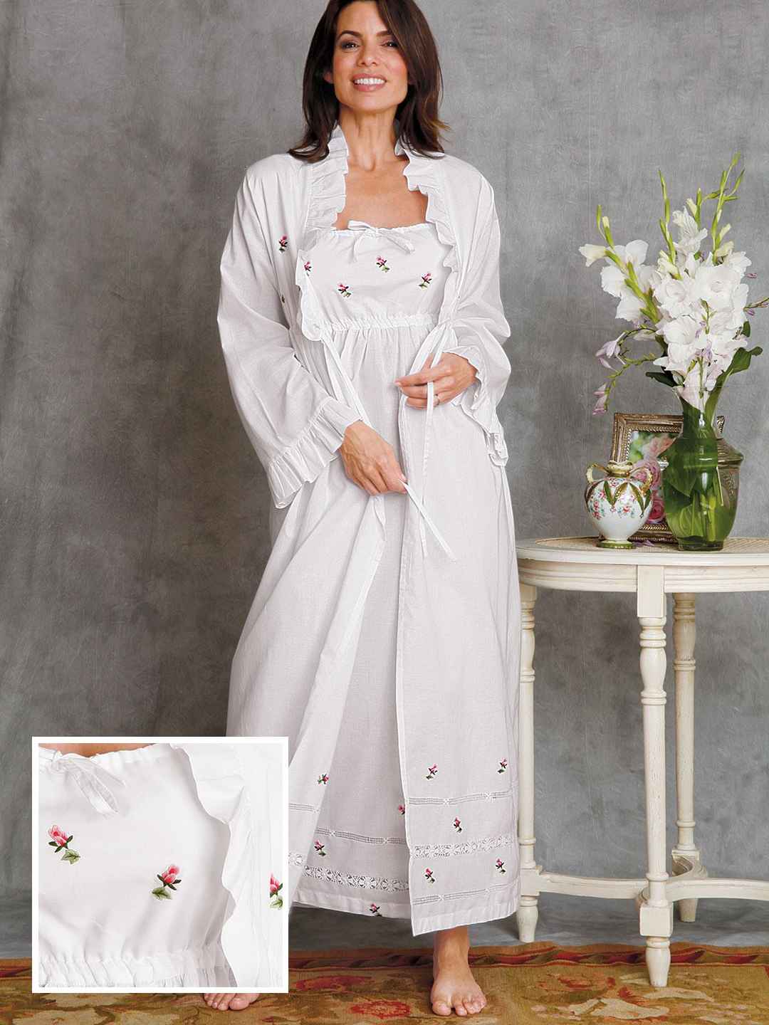 <p>Rosebuds Nightwear Robe, White (Small) Truly a gown to love and be loved in, this irresistible import is finest White cotton batiste preciously adorned with hand embroidered Pink rosebuds and exquisite hand crafted lace. Becomingly styled with elastic empire waist, a bare bodice with drawst...more