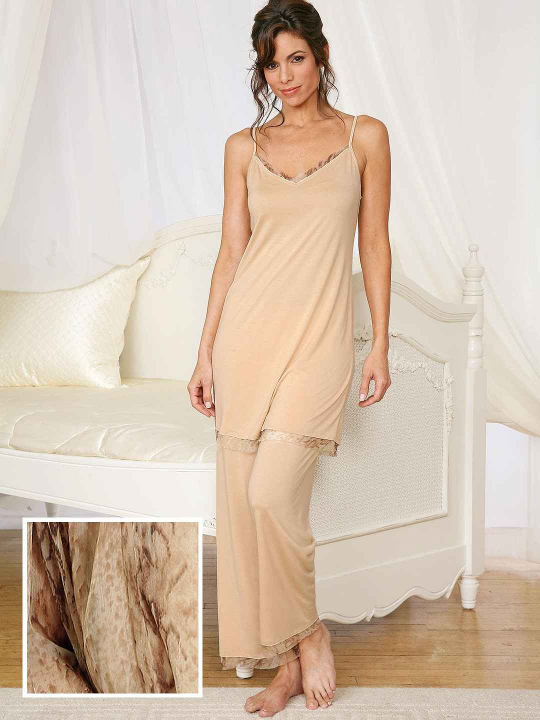 <p>Exotica Pants, N/A (Small) Let your spirit of adventure soar with exciting mix and match loungewear that dares you to endanger the male species. Soft and clingy, 85% silk and 15% cashmere jersey gives your desires an edge with borders of silk chiffon python print, as shown. Straight-leg pan...more