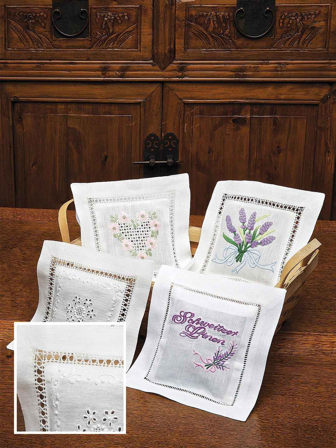 <p>Sachet Cachet Potpourri Sachet, Ring Around Posy (Set of 3) Lovely filled pockets full of potpourri for all your closets and drawers are daintily embroidered and hemstitched by hand. Made of finest Italian linen, with a soothing lavender rose scent inside, they open in back to accommodate y...more
