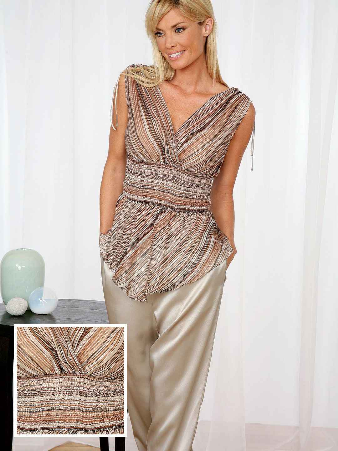 <p>Kali Pajama Camisole, N/A (Small) Too chic to stay at home, the intriguing striped cami of these lounging pajamas will tempt you to wear it for evenings out. Made of sheer pure silk georgette, with shirred shoulders, the elasticized shirred midriff is designed for flattery. Coordinated stra...more