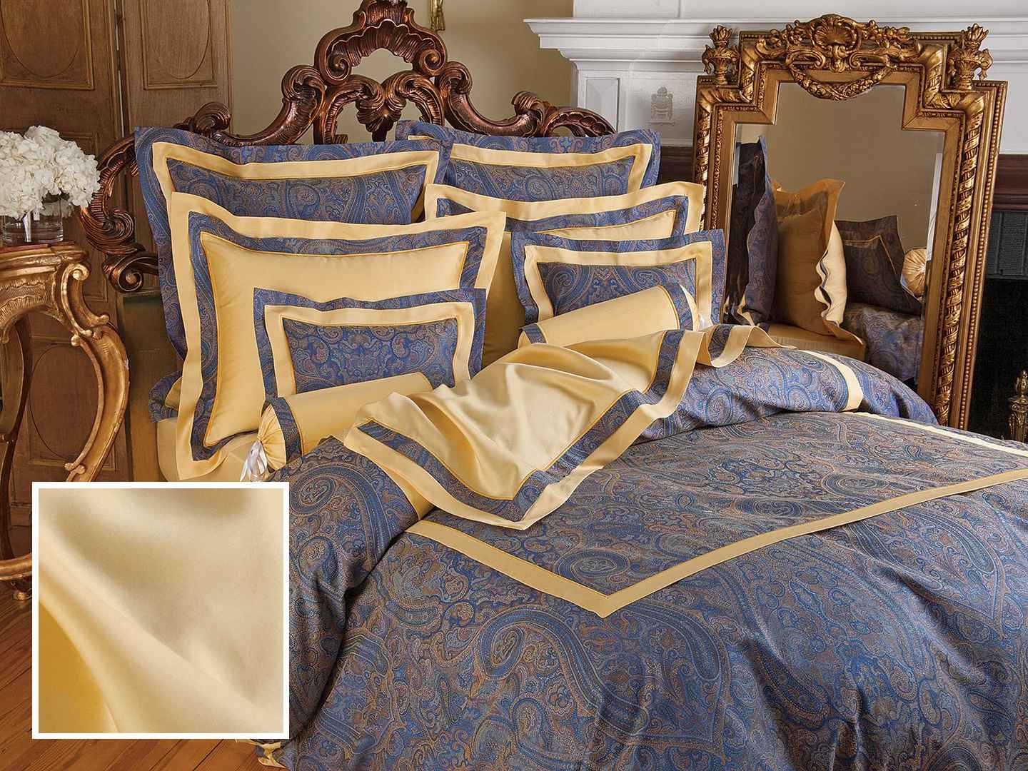 <p>Richelieu Fitted Sheets,Fitted Gold Sateen (Twin ) Capturing the beauty of the night in a palette of rarefied colors, our exclusive Blue paisley damask deepens the elegant allure of this ensemble. Duvet covers, euro (square) and boudoir shams are luxurious, 500 thread count, paisle...more