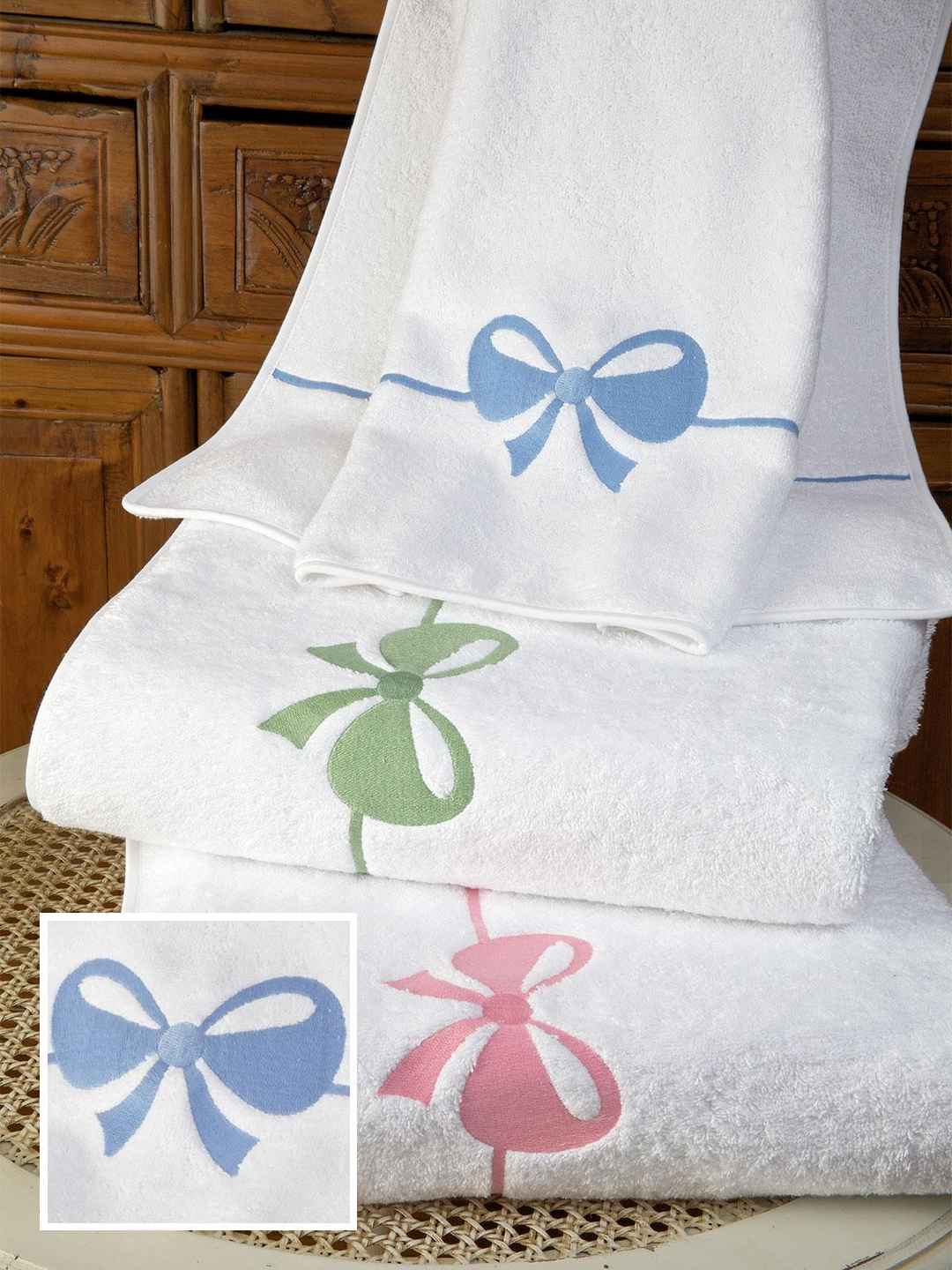 <p>Tiffani Bath Towels,Blue (Wash) Designed so you can wrap yourself in a soft cloud of luxurious White 100% cotton terry, this plush, super-absorbent towel comes with its own lovely bow-tied ribbon, embroidered in Pink, Blue, or Green. Made in Turkey, 600 grams per square meter, it makes the ...more
