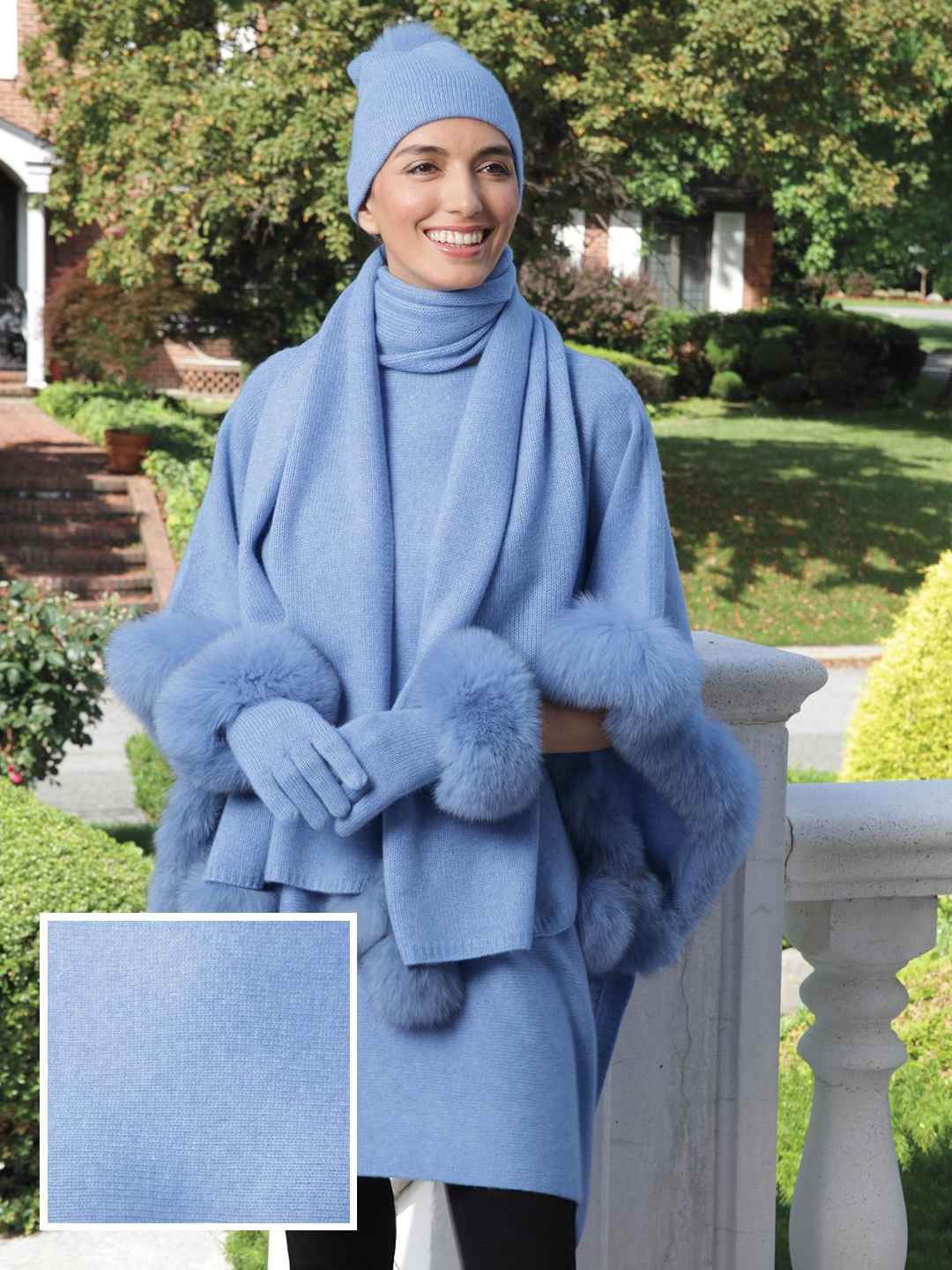 <p>Alexa Cashmere Poncho Set Scarf, Blue (One Size Fits Most) You can keep warm and be ever so glamorous in this luxurious matching poncho set (Items sold separately). Crafted of 100% cashmere, in Blue or Black, the poncho features fox fur edges on the arms. The beanie hat becomes a true fashi...more