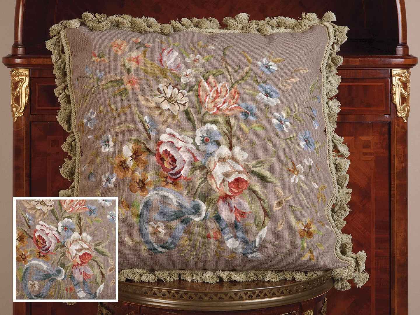 <p>Carlisle Needlepoint Pillows,Multi-Colored (22" x 22") The blossoms in this lavish bouquet are so profuse, they reach every corner of this hand needlepoint pillow. Crafted in 100% wool, this import is further detailed with sage green tassels and a matching 100% cotton velvet backi...more