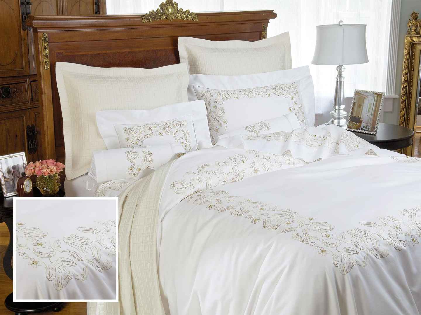 <p>Shadow Leaf Duvet Covers Bronze (Full,each) The complexity of hand-craftsmanship here is awesome to behold. With two shades of glittering Bronze and Lemon, feathery leaves and blossoms are gloriously embroidered and shadow-stitched completely by hand. Set on a field of finest 600 thread cou...more
