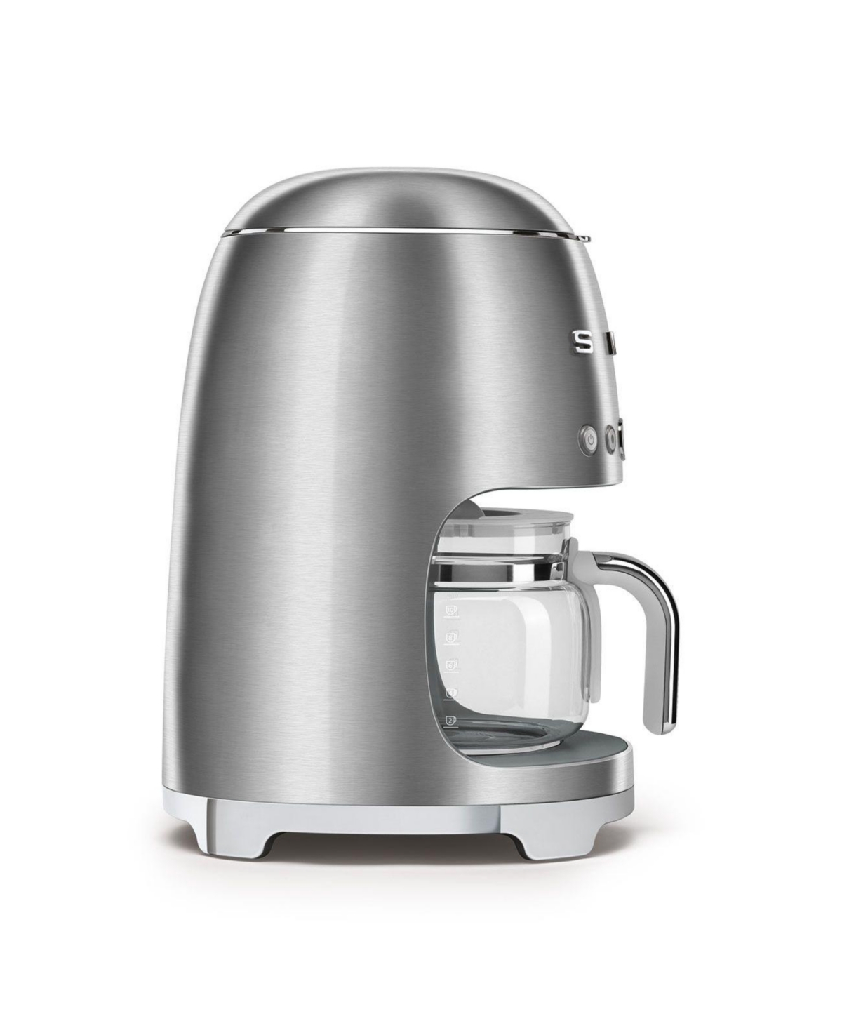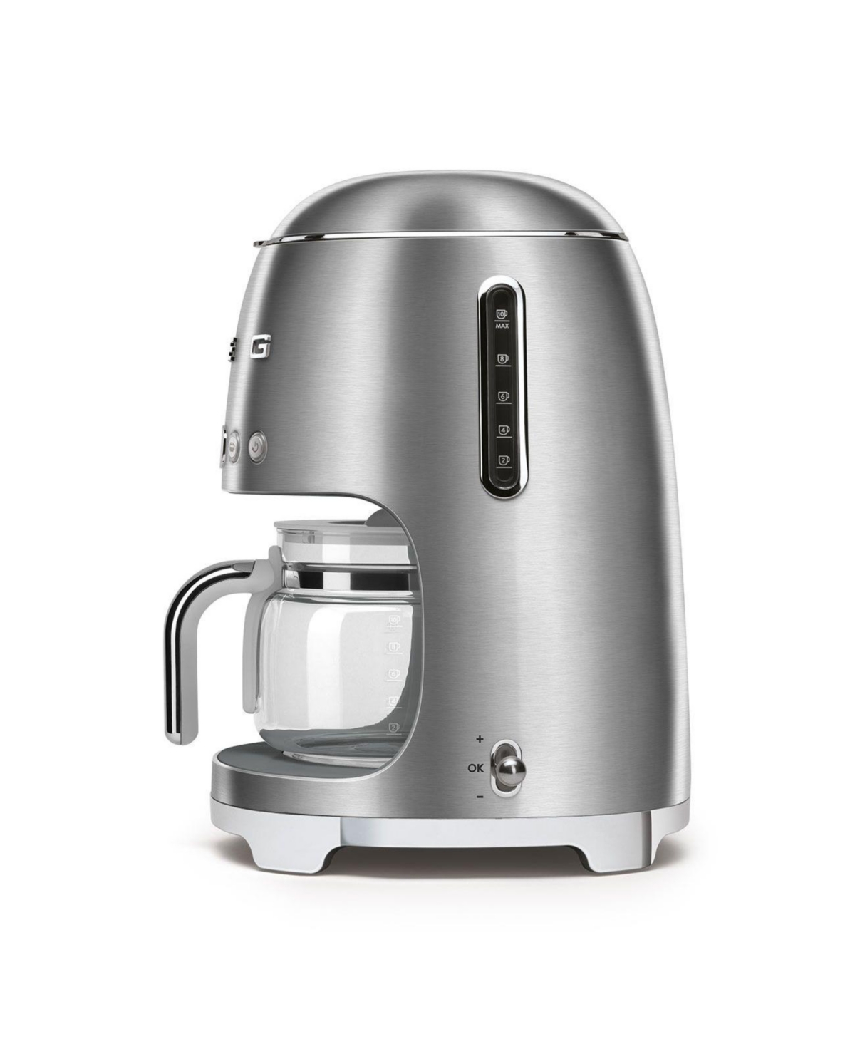 The Smeg Drip Filter Coffee Machine brews up to ten cups of coffee, or smaller quantities with the 4-cup function. Hold coffee at a constant temperature for up to an hour with the Keep Warm function. Switch sounds on or off, and set the time using a 12-hour or 24-hour clock.