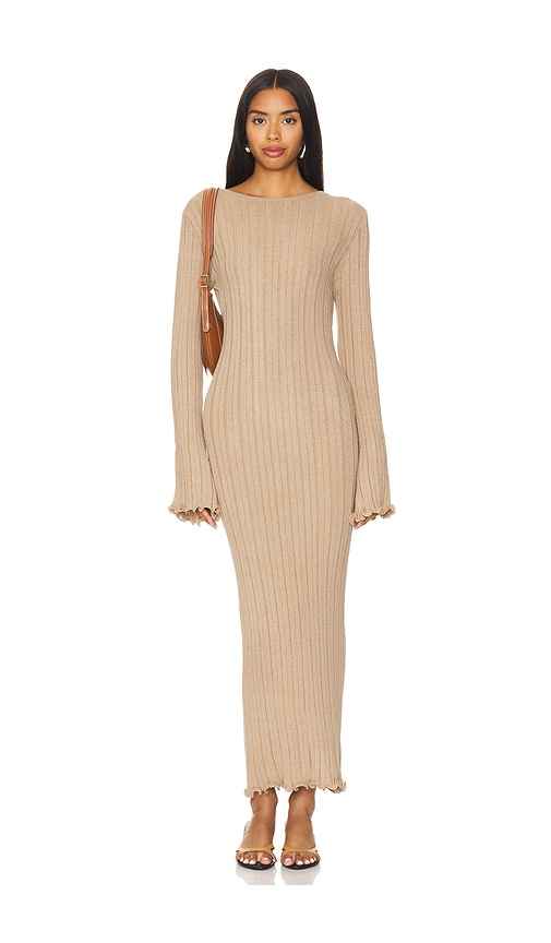 SNDYS Baha Long Sleeve Maxi Dress in Tan. - size XL (also in XXL) SNDYS Baha Long Sleeve Maxi Dress in Tan. - size XL (also in XXL) 63% viscose 37% nylon. Made in China. Machine wash. Unlined. Pull-on styling. Back cut-out. Lightweight wide ribbed knit fabric with lettuce trim. SDYS-WD241. SFD736. W...more