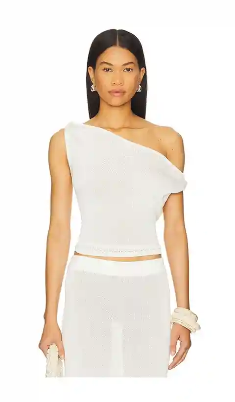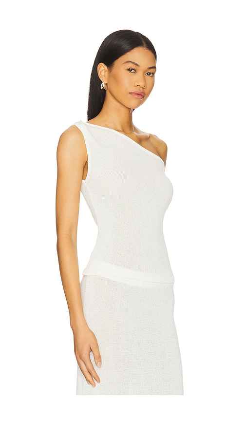 SNDYS Cali Top in White. - size L (also in XL) SNDYS Cali Top in White. - size L (also in XL) 100% recycled polyester. Machine wash. Pull-on styling. One shoulder styling. Midweight knit fabric. Item not sold as a set. Garment is made with a semi-sheer fabric, undergarments can show through. SDYS-WS...more