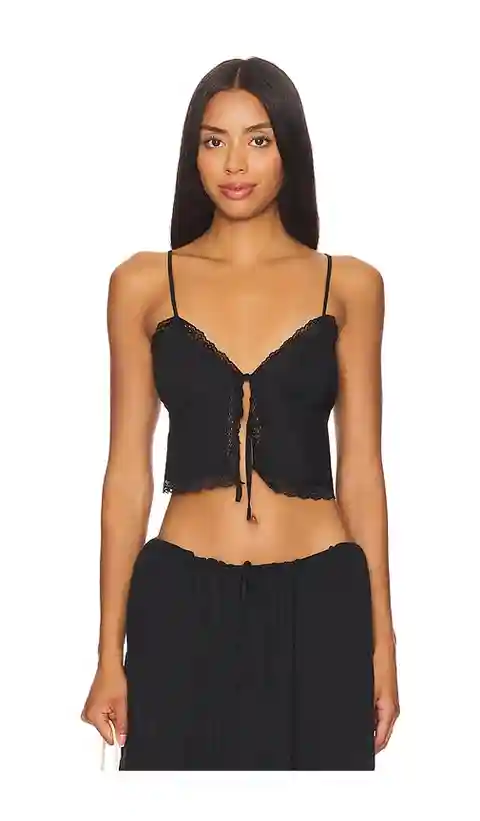 SNDYS Ophelia Tie Up Top in Black. - size L (also in M, S, XL, XXL) SNDYS Ophelia Tie Up Top in Black. - size L (also in M, S, XL, XXL) Self: 100% rayon Lining: 100% polyester. Made in China. Hand wash. Front single tie closure. Lightweight voile fabric with lace trim. Item not sold as a set. SDYS-W...more