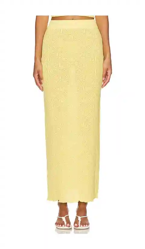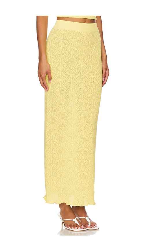 SNDYS x REVOLVE Josefina Skirt in Yellow. - size XL (also in XS, XXS) SNDYS x REVOLVE Josefina Skirt in Yellow. - size XL (also in XS, XXS) 63% viscose 37% nylon. Made in China. Machine wash. Unlined. Pull-on styling with elastic waistband. Midweight textured jersey fabric with lettuce hem. Item not...more