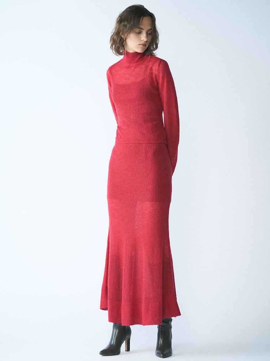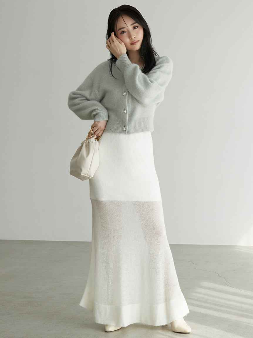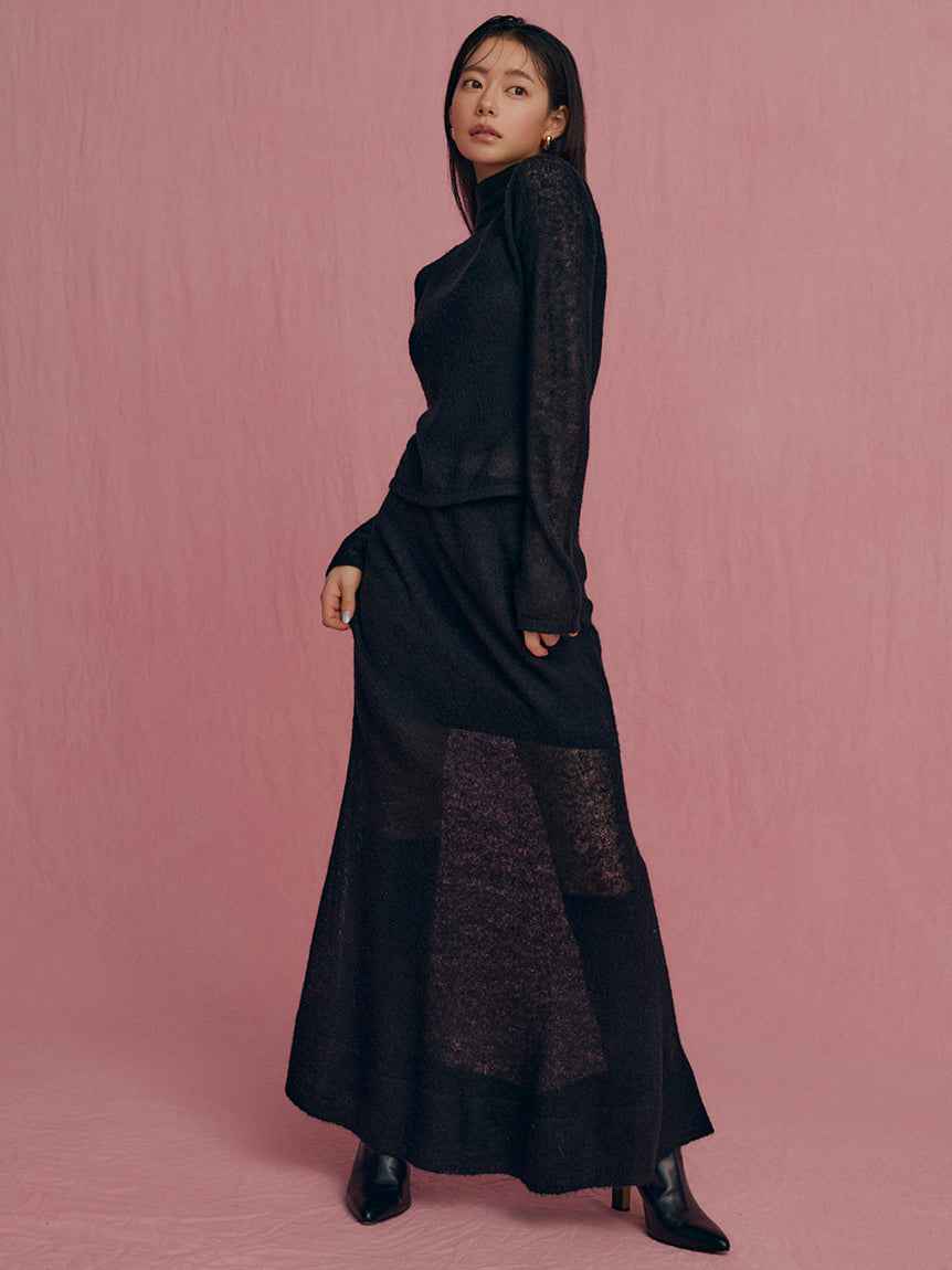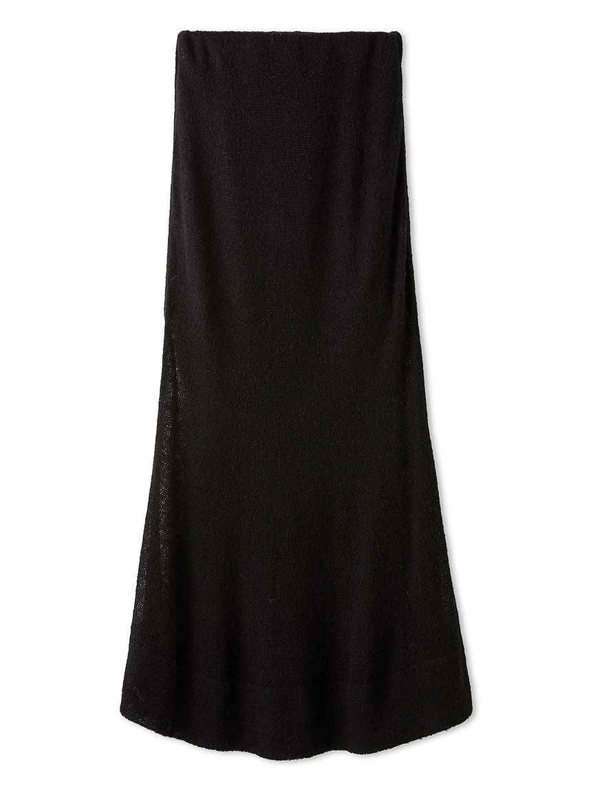 Sheer Knit Mohair Skirt A long knit skirt made of knit fabric that features an elegant mohair brushed texture and a light sheer knit. The inner is short to create a sheer look at the feet, so it can be enjoyed lightly with boots. The simple narrow silhouette makes it easy to balance with tops and is...more