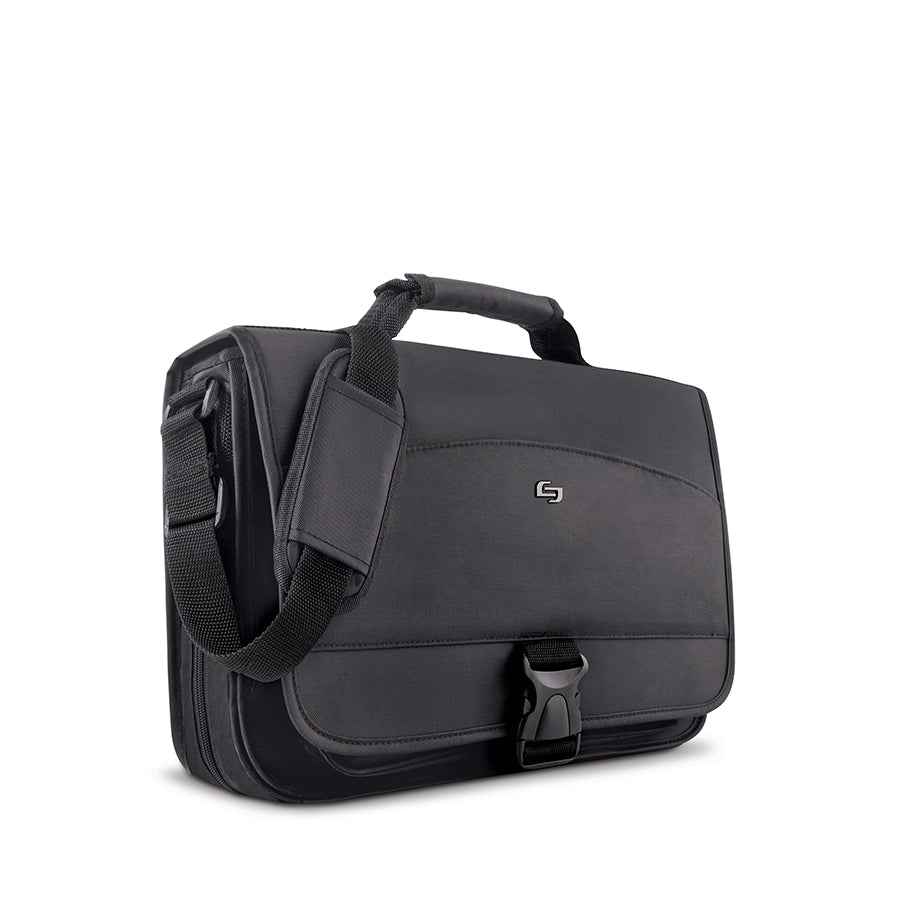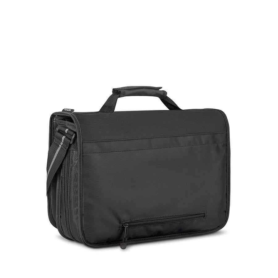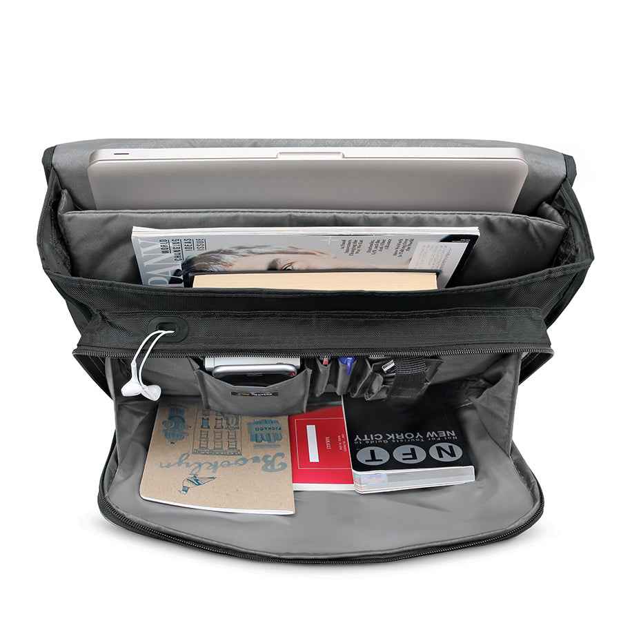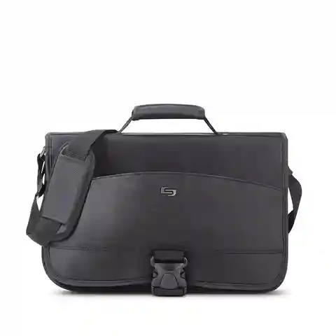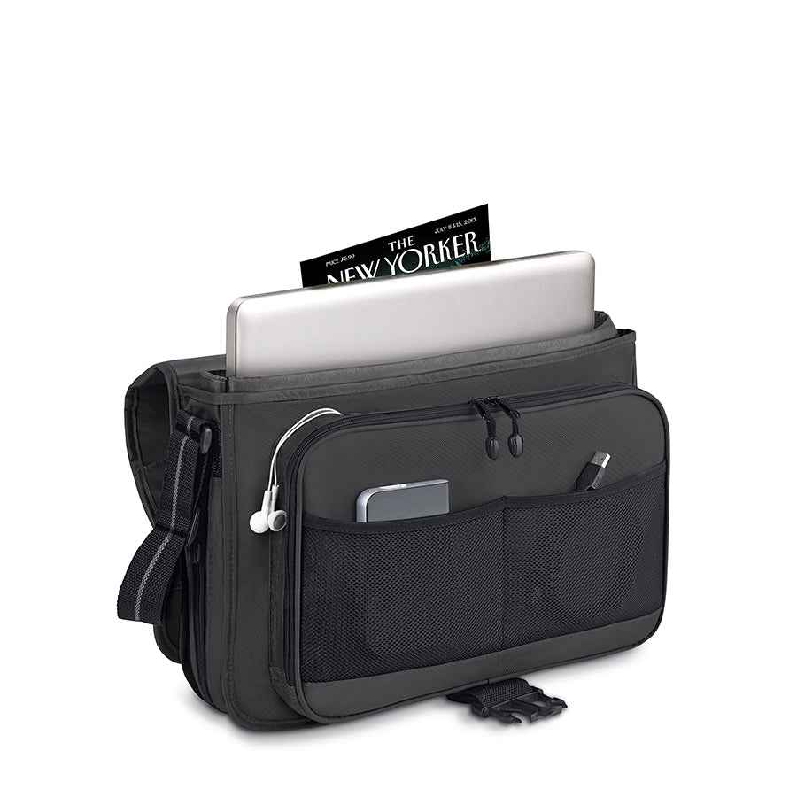 Fully padded 15.6" laptop compartment Main compartment expands 1" to increase storage capacity Full size zip-down organizer section Padded carry handle Adjustable shoulder strap Back pocket slides over luggage handle Rear pocket Speed buckle closure | Conquer Expandable Messenger with 15.6" Laptop C...more