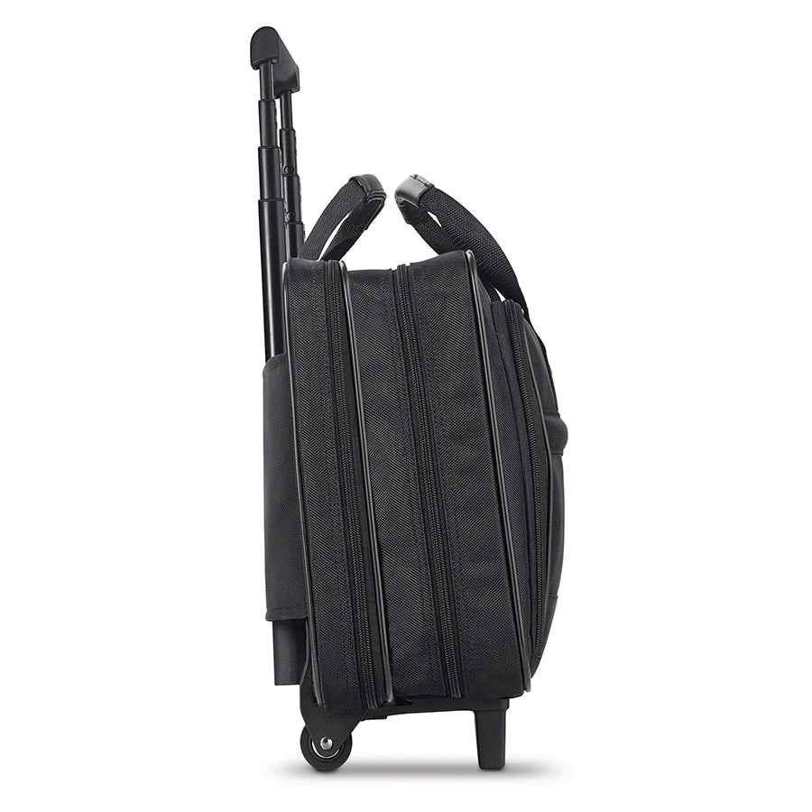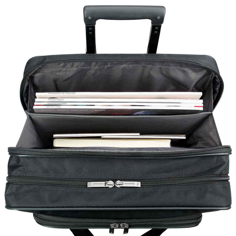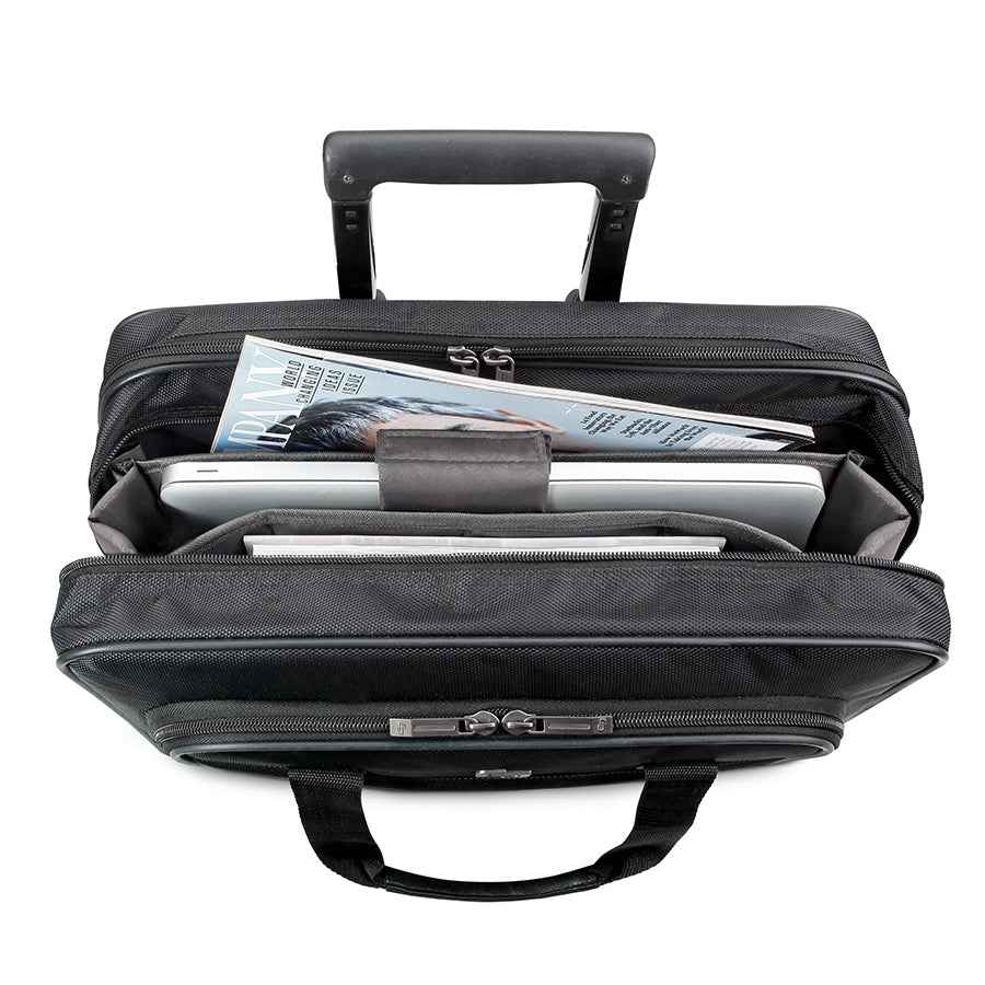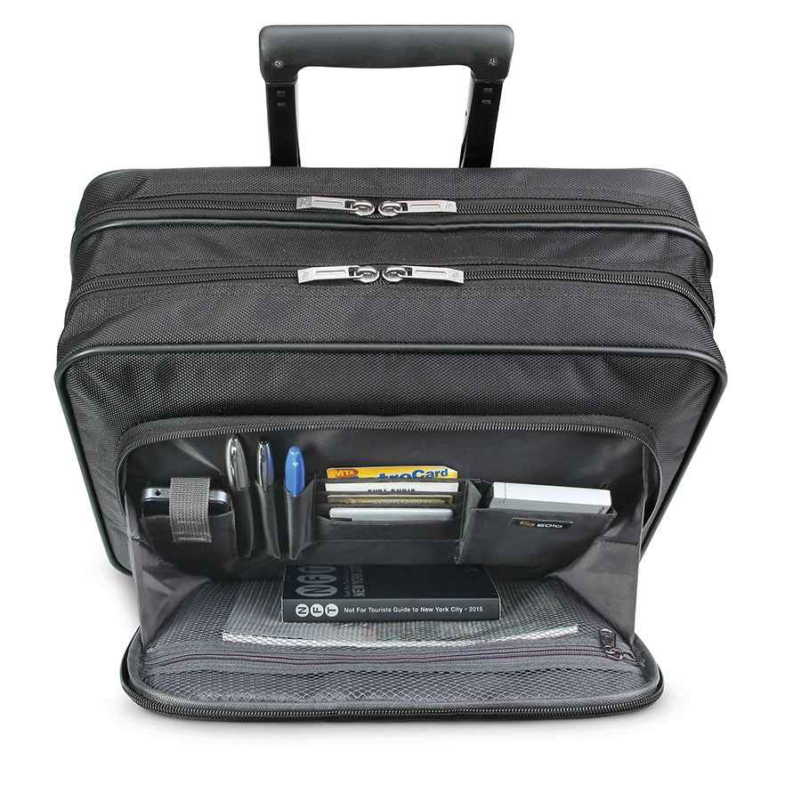Fully padded 15.6" laptop compartment Full size front zip-down organizer section Divided file compartment Padded carry handles Telescoping handle system Lightweight Polyester body | Carnegie Rolling Case with 15.6" Laptop Compartment by Solo New York in Black