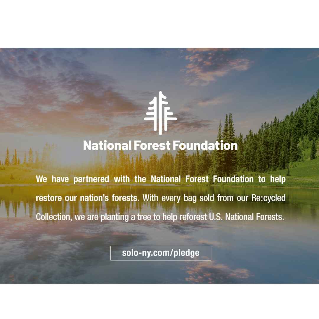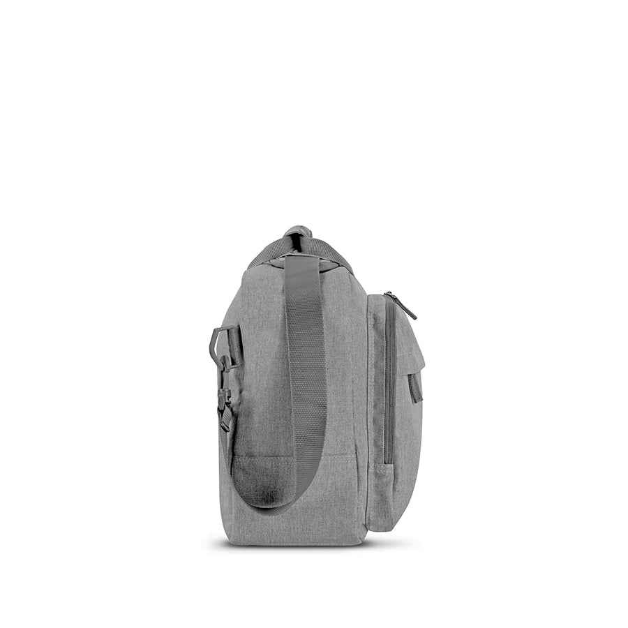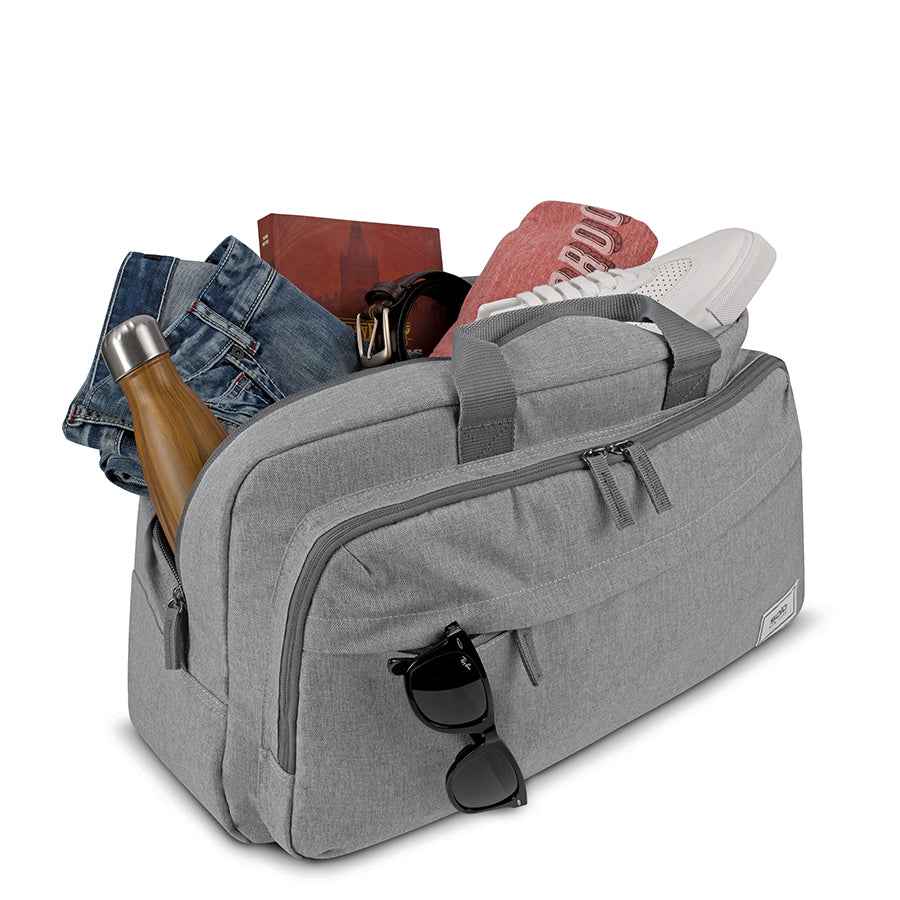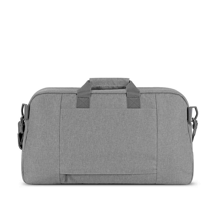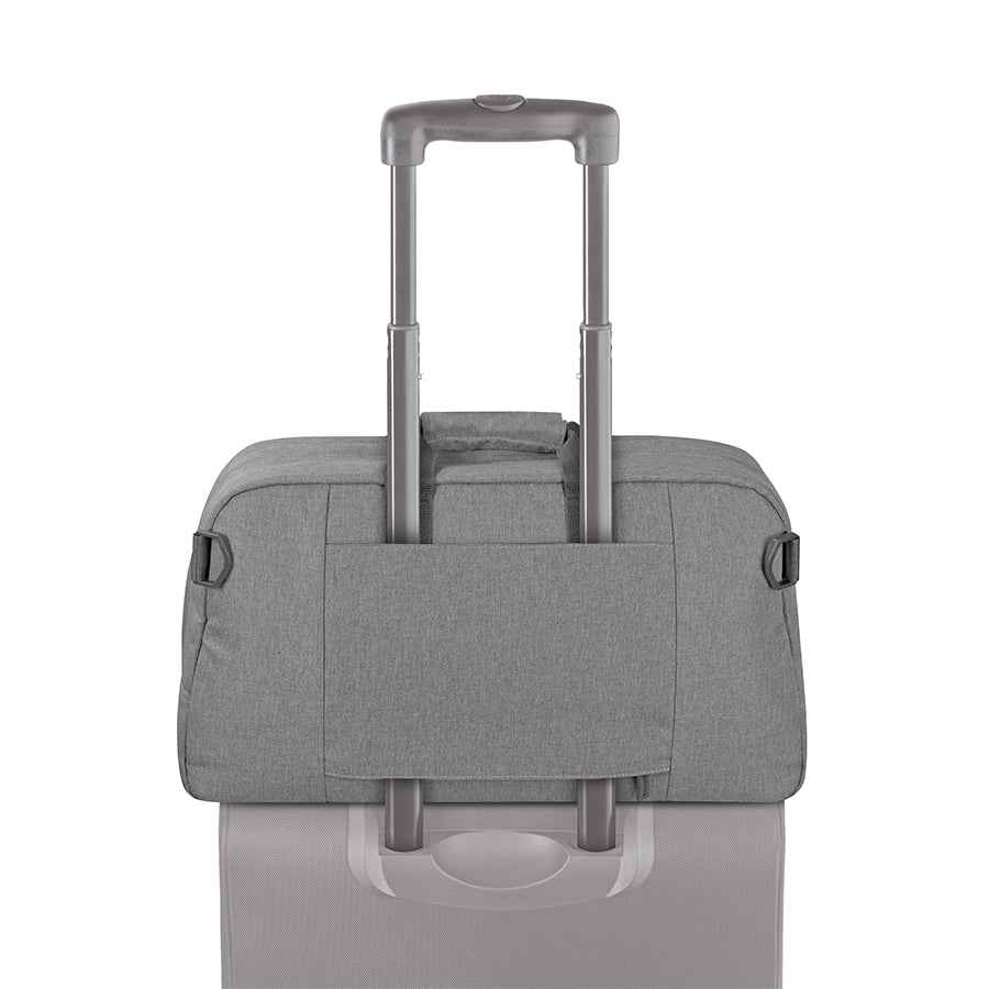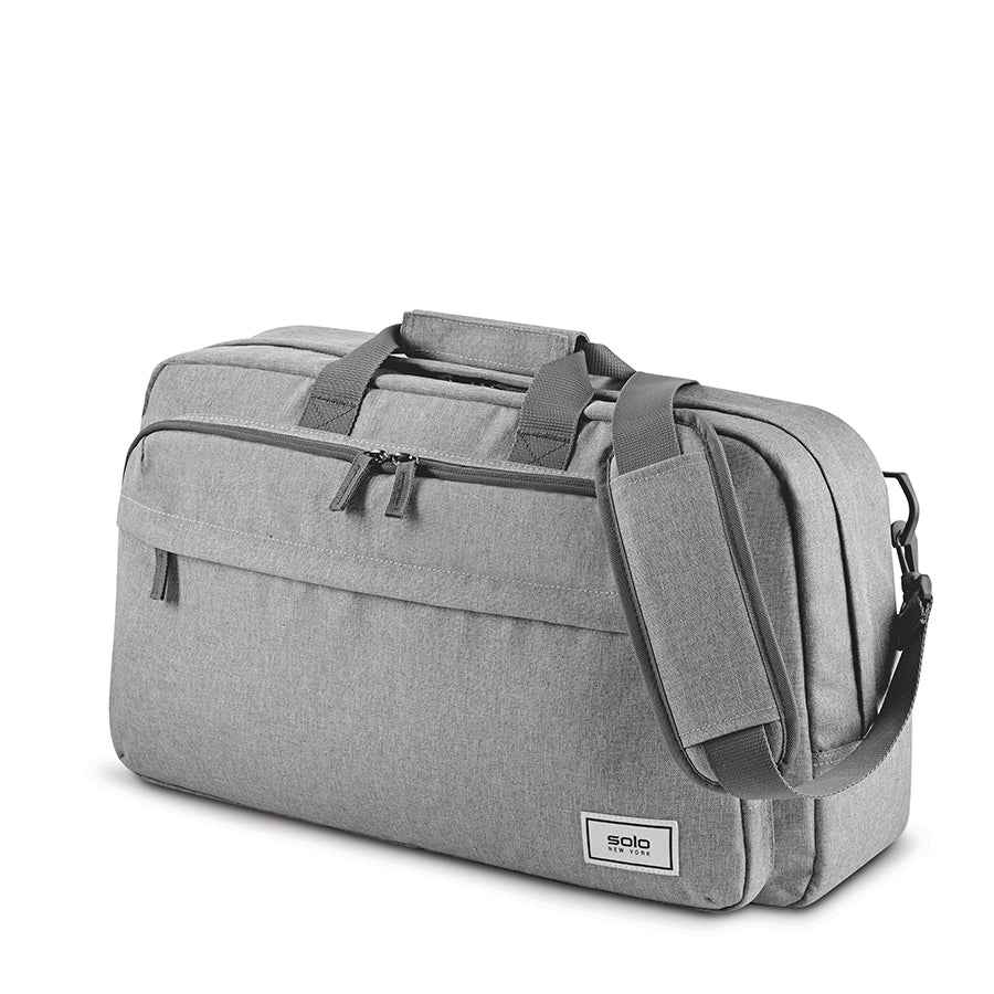 Heathered grey material made from recycled PET bottles Black camo lining Removable / adjustable shoulder straps Front zippered pocket Interior organizer section with key clip Back panel slides over luggage handle | Re:move Duffel by Solo New York in Grey