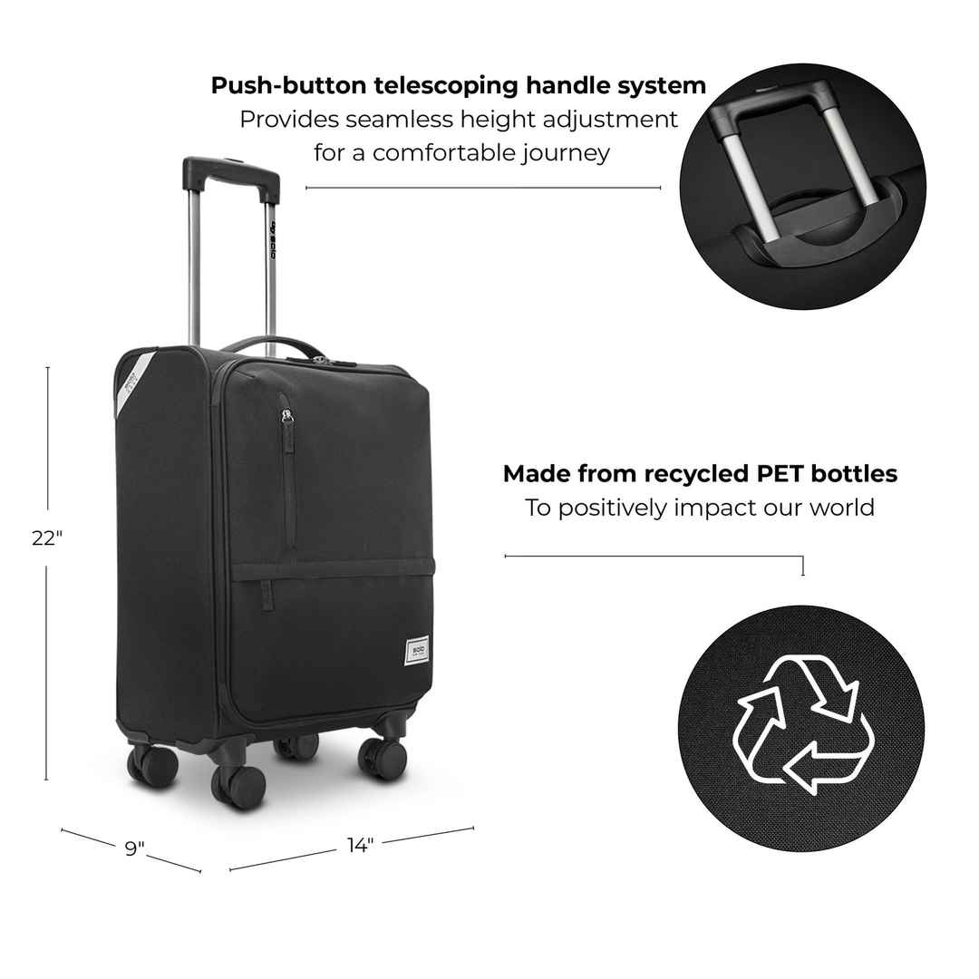 Our Re:treat Carry-On Spinner is roomy, stylish, durable, water-resistant, and glides over whatever your journey throws at it so you can handle non-stop travel, sustainably. And when you are not busy traveling, this carry-on suitcase easily nests inside of your Re:treat Check-in Spinner. | Re:treat ...more