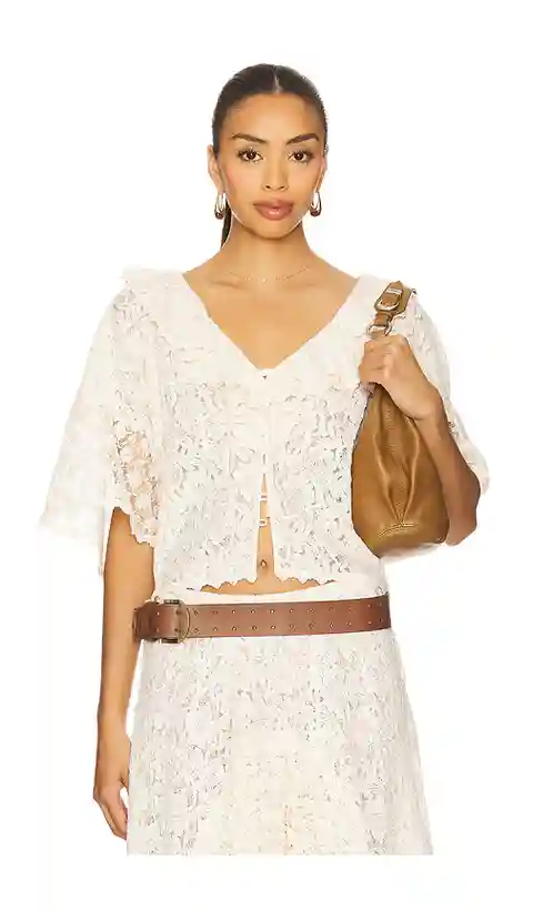 SPELL Lux Lisbon Lace Blouse in Cream. - size L (also in S) SPELL Lux Lisbon Lace Blouse in Cream. - size L (also in S) 70% cotton 30% nylon. Imported. Hand wash recommended. Front button closure. Front self-tie closure. Collared neckline. Midweight lace fabric Garment is made with a semi-sheer fabr...more