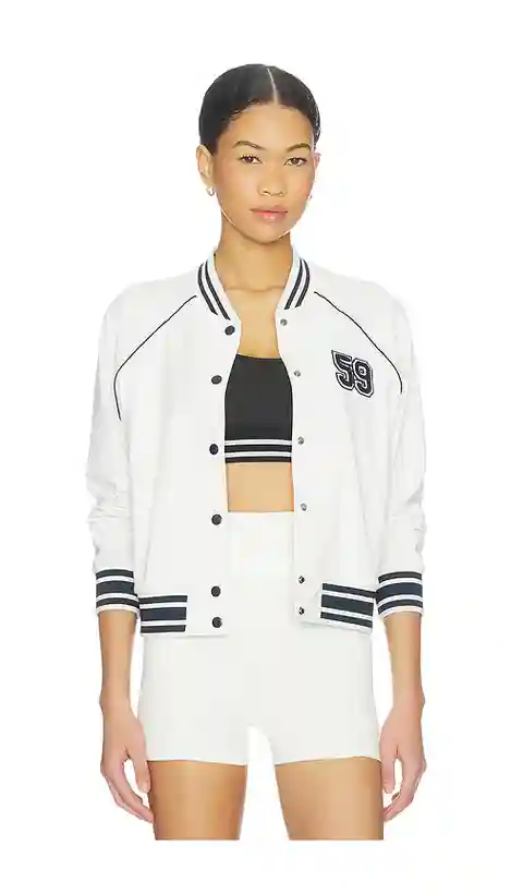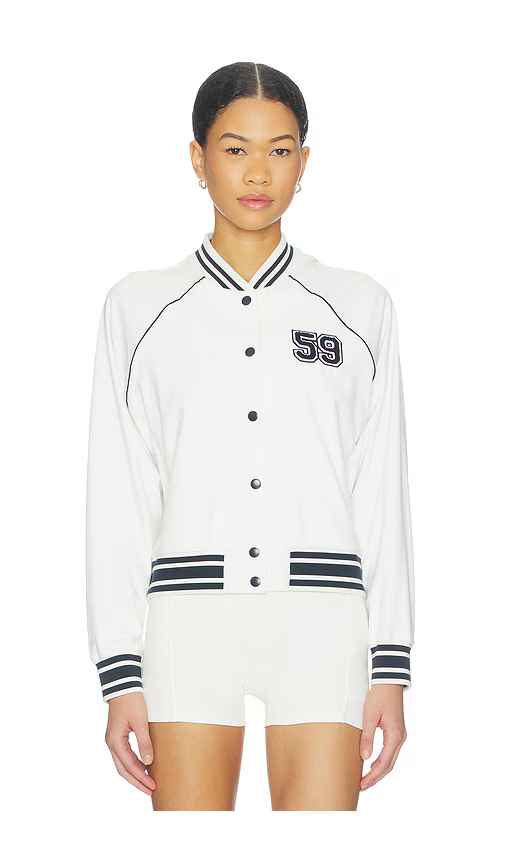 Splits59 Hayes Varsity Rigor Jacket in White. - size L (also in M, S, XL, XS) Splits59 Hayes Varsity Rigor Jacket in White. - size L (also in M, S, XL, XS) 62% nylon 38% spandex. Machine wash. Front snap button closure. Side zip pockets. Ribbed trim. Lightweight jersey fabric. SPLR-WO15. #I2055_WHIT...more