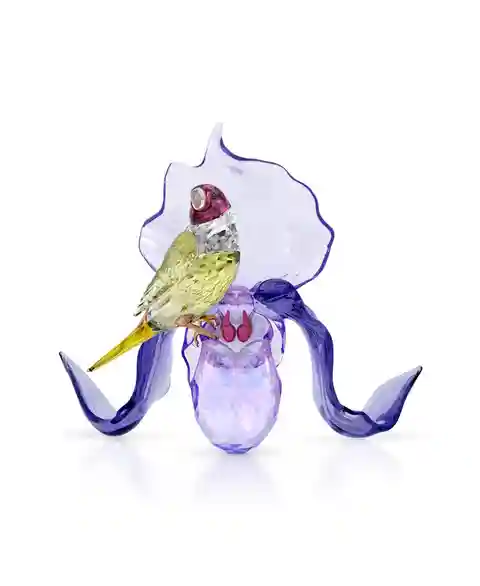 Two of nature's most colorful creations are combined in this vivid Swarovski design. The delicate scene has been crafted with 679 precision-cut facets, and showcases a red-headed Gouldian finch sitting atop a purple orchid. Since 1895, Swarovski has been committed to philanthropy and continuously in...more