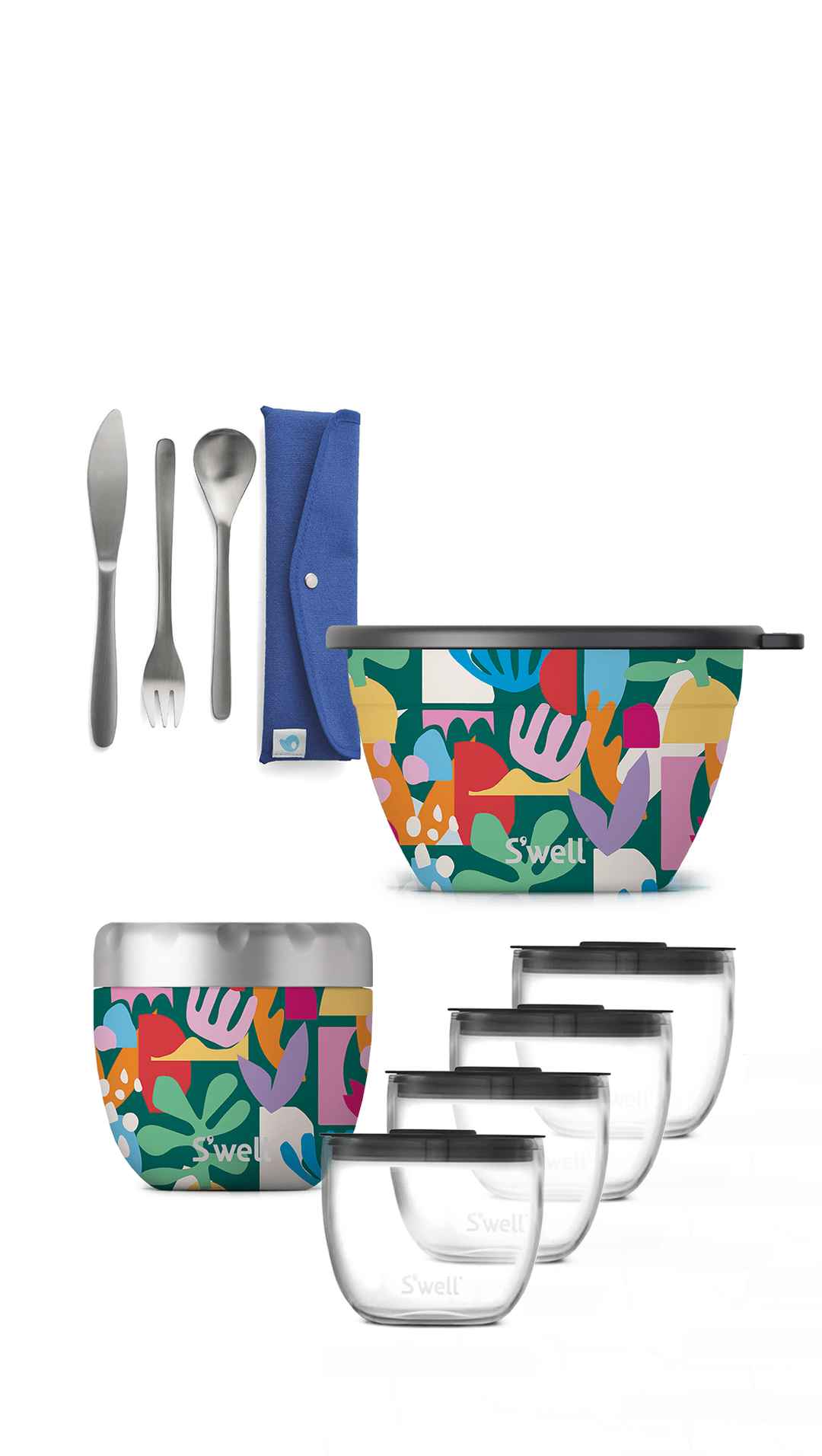 Prep and pack your lunch and snacks with ease using this set of mealtime essentials. Featuring our signature S'well Eats, Salad Bowl Kit, Glass Prep Bowl Set and Cutlery Set. S'well Paper Cutouts Prep and Pack Set | Multicolor | Eco-friendly, Reusable Set .