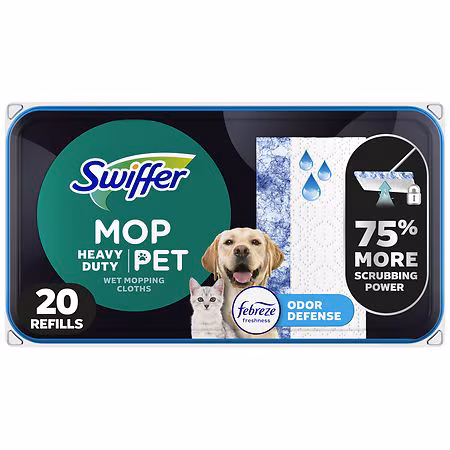 Swiffer Sweeper Heavy Duty Wet Mopping cloths now have 75% more scrubbing power* to tackle tough messes. The pads are designed for quick clean ups in small spaces, making them a perfect choice for kitchens, bathrooms, and more. Plus, they are safe to use on all finished floors**. Enjoy long lasting ...more